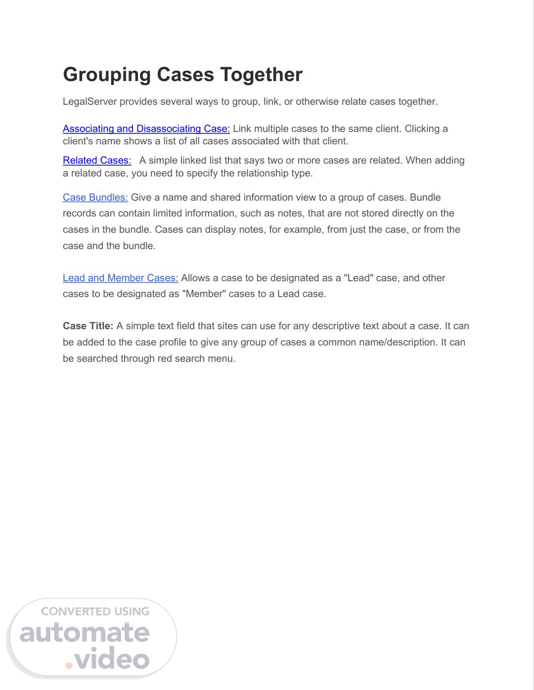 Grouping Cases Together LegalServer provides several ways to group, link, or otherwise relate cases together. Associating and Disassociating Case: Link multiple cases to the same client. Clicking a client's name shows a list of all cases associated with that client. Related Cases: A simple linked list that says two or more cases are related. When adding a related case, you need to specify the relationship type. Case Bundles: Give a name and shared information view to a group of cases. Bundle records can contain limited information, such as notes, that are not stored directly on the cases in the bundle. Cases can display notes, for example, from just the case, or from the case and the bundle. Lead and Member Cases: Allows a case to be designated as a "Lead" case, and other cases to be designated as "Member" cases to a Lead case. Case Title: A simple text field that sites can use for any descriptive text about a case. It can be added to the case profile to give any group of cases a common name/description. It can be searched through red search menu..