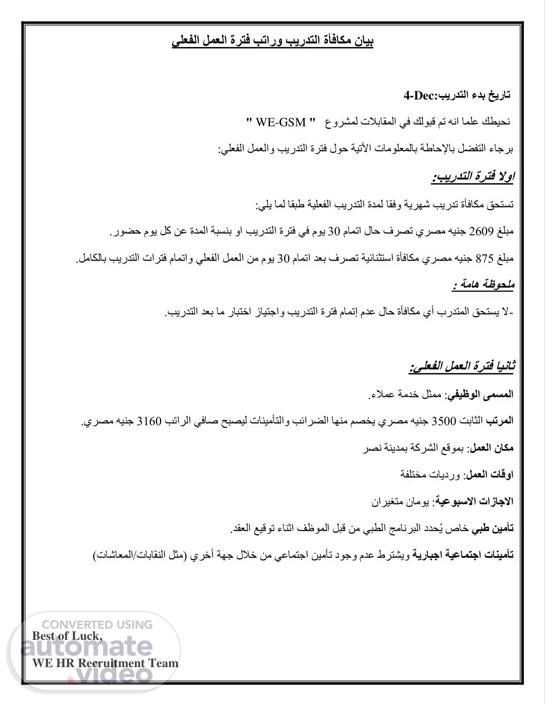 يلعفلا لمعلا ةرتف بتارو بيردتلا ةأفاكم نايب 4-Dec :بيردتلا ءدب خيرات " WE-GSM " تلاباقملا يف كلوبق مت هنا املع كطيحن عورشمل ةيتلأا تامولعملاب ةطاحلإاب لضفتلا ءاجربو بيردتلا ةرتف لوح :يلعفلا لمعلا الاو :بيردتلا ةرتف أفاكم قحتستة ةيرهش بيردتاقفو ةيلعفلا بيردتلا ةدمل :يلي امل اقبط غلبم2609 ينجيرصم ه مامتا لاح فرصت30 موي يف بيردتلا ةرتفروضح موي لك نع ةدملا ةبسنب وا . غلبم875 ينجيرصم ه ةيئانثتسا ةأفاكم مامتا دعب فرصت30 يلعفلا لمعلا نم موي .لماكلاب بيردتلا تارتف مامتاو ةماه ةظوحلم : - بردتملا قحتسي لايأ بيردتلا ةرتف مامتإ مدع لاح ةأفاكم .بيردتلا دعب ام رابتخا زايتجاو :يلعفلا لمعلا ةرتف ايناث مسملاى يفيظولالثمم : لامع ةمدخ .ء بترملا تباثلا 3500 يرصم هينجيمصخ اهنم بئارضلاتانيمأتلاو لحبصي بتارلا يفاص 3160 .يرصم هينج لمعلا ناكم :ب ةكرشلا عقومبرصن ةنيدم لمعلا تاقوا :ةفلتخم تايدرو ةيعوبسلاا تازاجلااريغتم ناموي :ا ن نيمأتيبط صاخ يجمانربلا ددح يبطلا .دقعلا عيقوت ءانثا فظوملا لبق نم نيمأتتا يعامتجاة يرابجاة نيمأت دوجو مدع طرتشيويعامتجا للاخ نمةهج )تاشاعملا/تاباقنلا لثم( يرخأ Best of Luck, WE HR Recruitment Team.