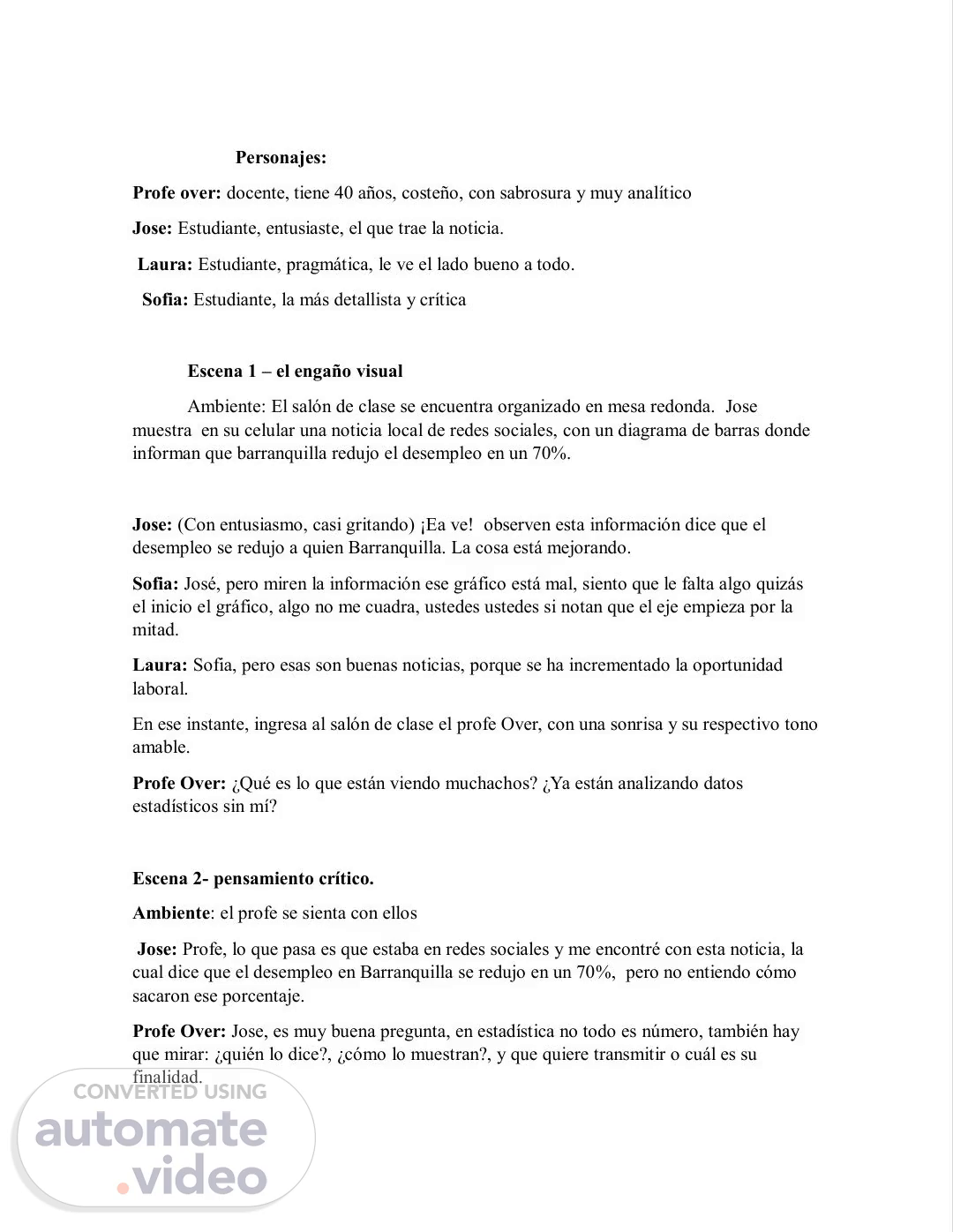 Personajes: Profe over: docente, tiene 40 años, costeño, con sabrosura y muy analítico Jose: Estudiante, entusiaste, el que trae la noticia. Laura: Estudiante, pragmática, le ve el lado bueno a todo. Sofia: Estudiante, la más detallista y crítica Escena 1 – el engaño visual Ambiente: El salón de clase se encuentra organizado en mesa redonda. Jose muestra en su celular una noticia local de redes sociales, con un diagrama de barras donde informan que barranquilla redujo el desempleo en un 70%. Jose: (Con entusiasmo, casi gritando) ¡Ea ve! observen esta información dice que el desempleo se redujo a quien Barranquilla. La cosa está mejorando. Sofia: José, pero miren la información ese gráfico está mal, siento que le falta algo quizás el inicio el gráfico, algo no me cuadra, ustedes ustedes si notan que el eje empieza por la mitad. Laura: Sofia, pero esas son buenas noticias, porque se ha incrementado la oportunidad laboral. En ese instante, ingresa al salón de clase el profe Over, con una sonrisa y su respectivo tono amable. Profe Over: ¿Qué es lo que están viendo muchachos? ¿Ya están analizando datos estadísticos sin mí? Escena 2- pensamiento crítico. Ambiente: el profe se sienta con ellos Jose: Profe, lo que pasa es que estaba en redes sociales y me encontré con esta noticia, la cual dice que el desempleo en Barranquilla se redujo en un 70%, pero no entiendo cómo sacaron ese porcentaje. Profe Over: Jose, es muy buena pregunta, en estadística no todo es número, también hay que mirar: ¿quién lo dice?, ¿cómo lo muestran?, y que quiere transmitir o cuál es su finalidad..