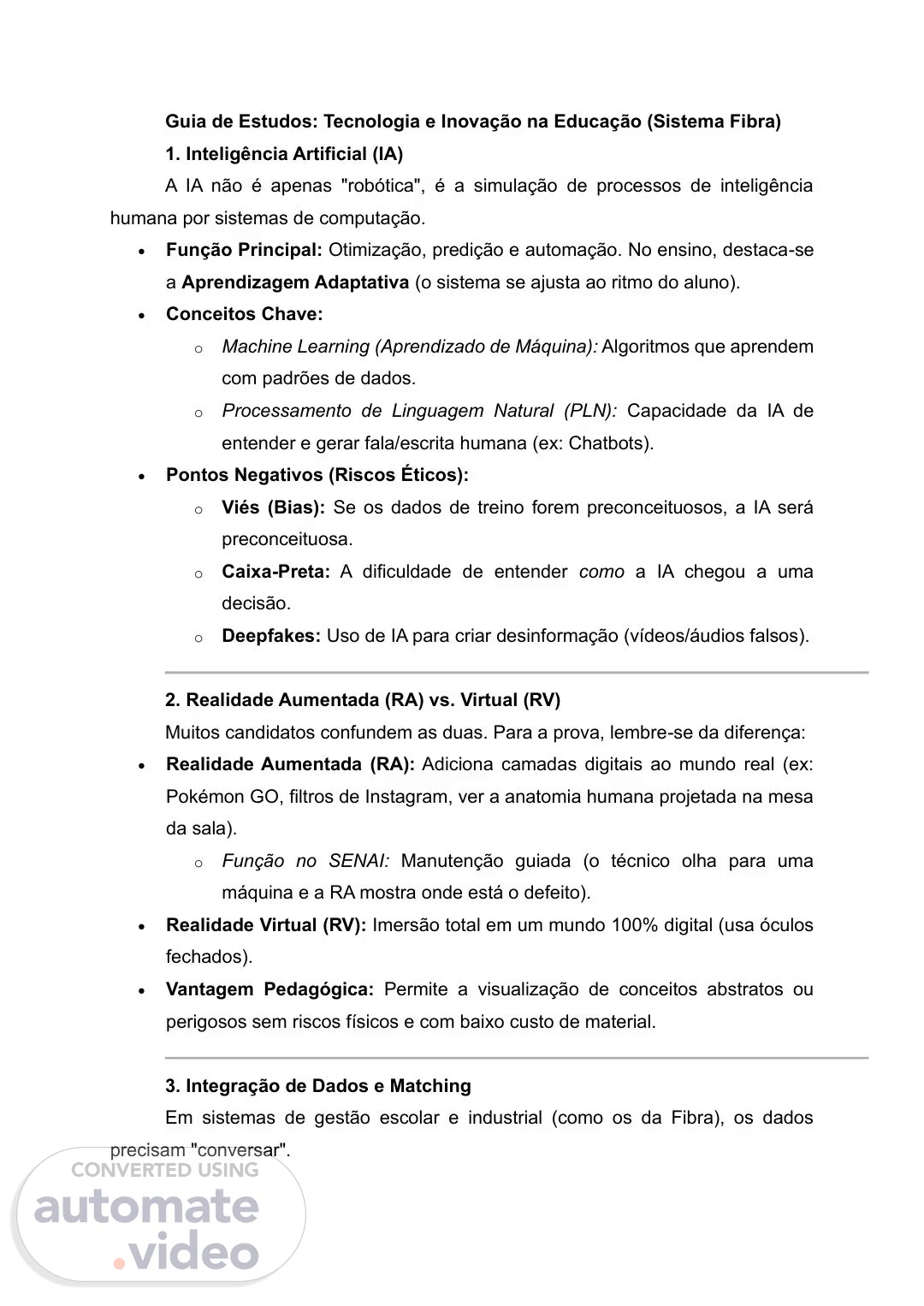 Guia de Estudos: Tecnologia e Inovação na Educação (Sistema Fibra) 1. Inteligência Artificial (IA) A IA não é apenas "robótica", é a simulação de processos de inteligência humana por sistemas de computação. • Função Principal: Otimização, predição e automação. No ensino, destaca-se a Aprendizagem Adaptativa (o sistema se ajusta ao ritmo do aluno). • Conceitos Chave: o Machine Learning (Aprendizado de Máquina): Algoritmos que aprendem com padrões de dados. o Processamento de Linguagem Natural (PLN): Capacidade da IA de entender e gerar fala/escrita humana (ex: Chatbots). • Pontos Negativos (Riscos Éticos): o Viés (Bias): Se os dados de treino forem preconceituosos, a IA será preconceituosa. o Caixa-Preta: A dificuldade de entender como a IA chegou a uma decisão. o Deepfakes: Uso de IA para criar desinformação (vídeos/áudios falsos). 2. Realidade Aumentada (RA) vs. Virtual (RV) Muitos candidatos confundem as duas. Para a prova, lembre-se da diferença: • Realidade Aumentada (RA): Adiciona camadas digitais ao mundo real (ex: Pokémon GO, filtros de Instagram, ver a anatomia humana projetada na mesa da sala). o Função no SENAI: Manutenção guiada (o técnico olha para uma máquina e a RA mostra onde está o defeito). • Realidade Virtual (RV): Imersão total em um mundo 100% digital (usa óculos fechados). • Vantagem Pedagógica: Permite a visualização de conceitos abstratos ou perigosos sem riscos físicos e com baixo custo de material. 3. Integração de Dados e Matching Em sistemas de gestão escolar e industrial (como os da Fibra), os dados precisam "conversar"..