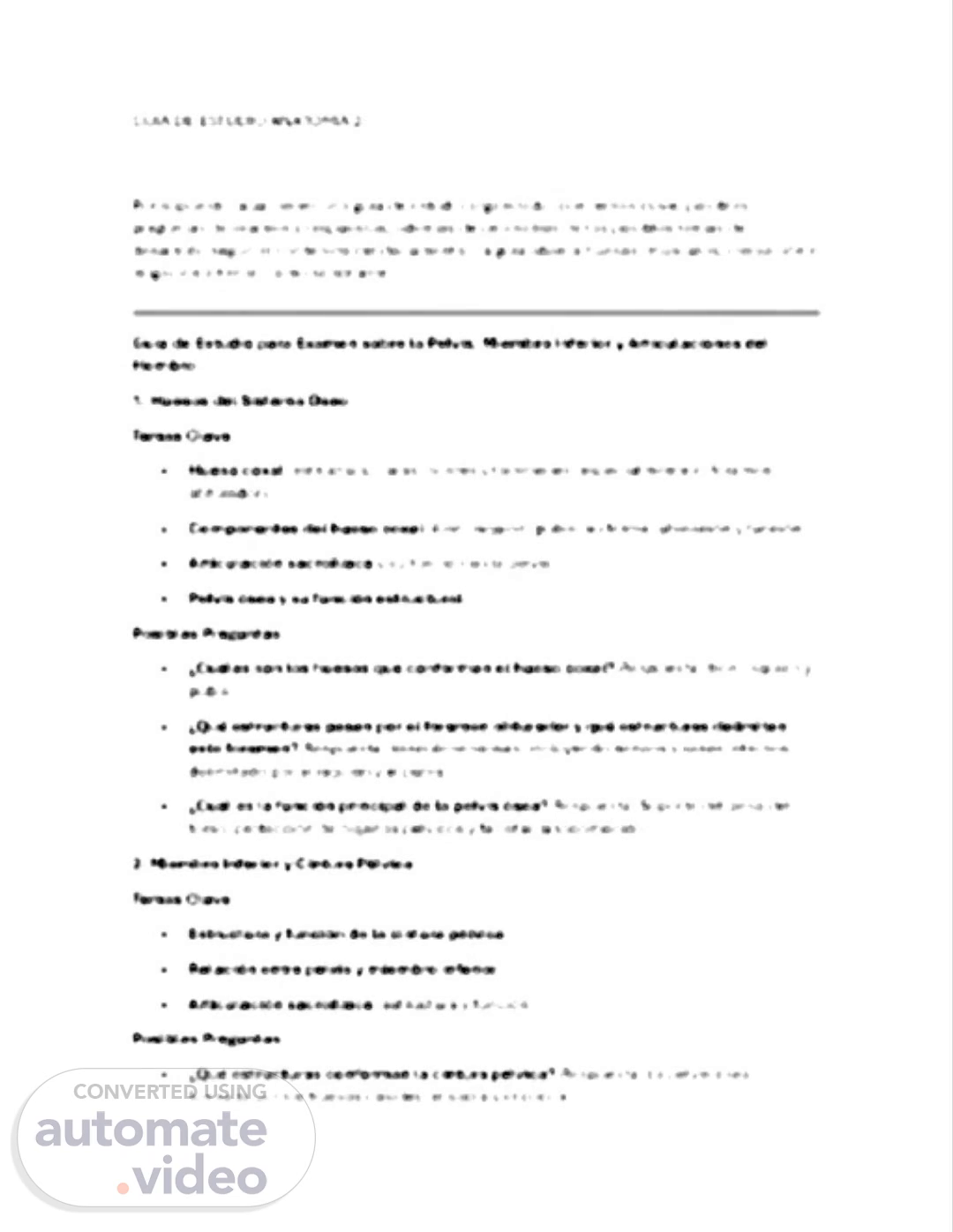 GUIA DE ESTUDIO ANATOMIA 2 Por supuesto, aquí tienes una guía de estudio organizada, con temas clave, posibles preguntas de examen y respuestas, además de un análisis de los posibles temas de desarrollo según el contenido del documento. La guía abarca huesos, músculos, inervación e irrigación arterial, como solicitaste. Guía de Estudio para Examen sobre la Pelvis, Miembro Inferior y Articulaciones del Hombro 1. Huesos del Sistema Óseo Temas Clave  Hueso coxal: estructura, caras, bordes y forámenes (especialmente el foramen obturador).  Componentes del hueso coxal: ilion, isquion, pubis; su forma, ubicación y función.  Articulación sacroilíaca y su función en la pelvis.  Pelvis ósea y su función estructural. Posibles Preguntas  ¿Cuáles son los huesos que conforman el hueso coxal? Respuesta: Ilion, isquion y pubis.  ¿Qué estructuras pasan por el foramen obturador y qué estructuras delimitan este foramen? Respuesta: Vasculonerviosas, incluyendo nervios y vasos internos; delimitado por el isquion y el pubis.  ¿Cuál es la función principal de la pelvis ósea? Respuesta: Soporte del peso del torso, protección de órganos pélvicos y facilitar la locomoción. 2. Miembro Inferior y Cintura Pélvica Temas Clave  Estructura y función de la cintura pélvica.  Relación entre pelvis y miembro inferior.  Articulación sacroilíaca: estructura y función. Posibles Preguntas  ¿Qué estructuras conforman la cintura pélvica? Respuesta: La pelvis ósea, formada por los huesos coxales, el sacro y el cóccix..