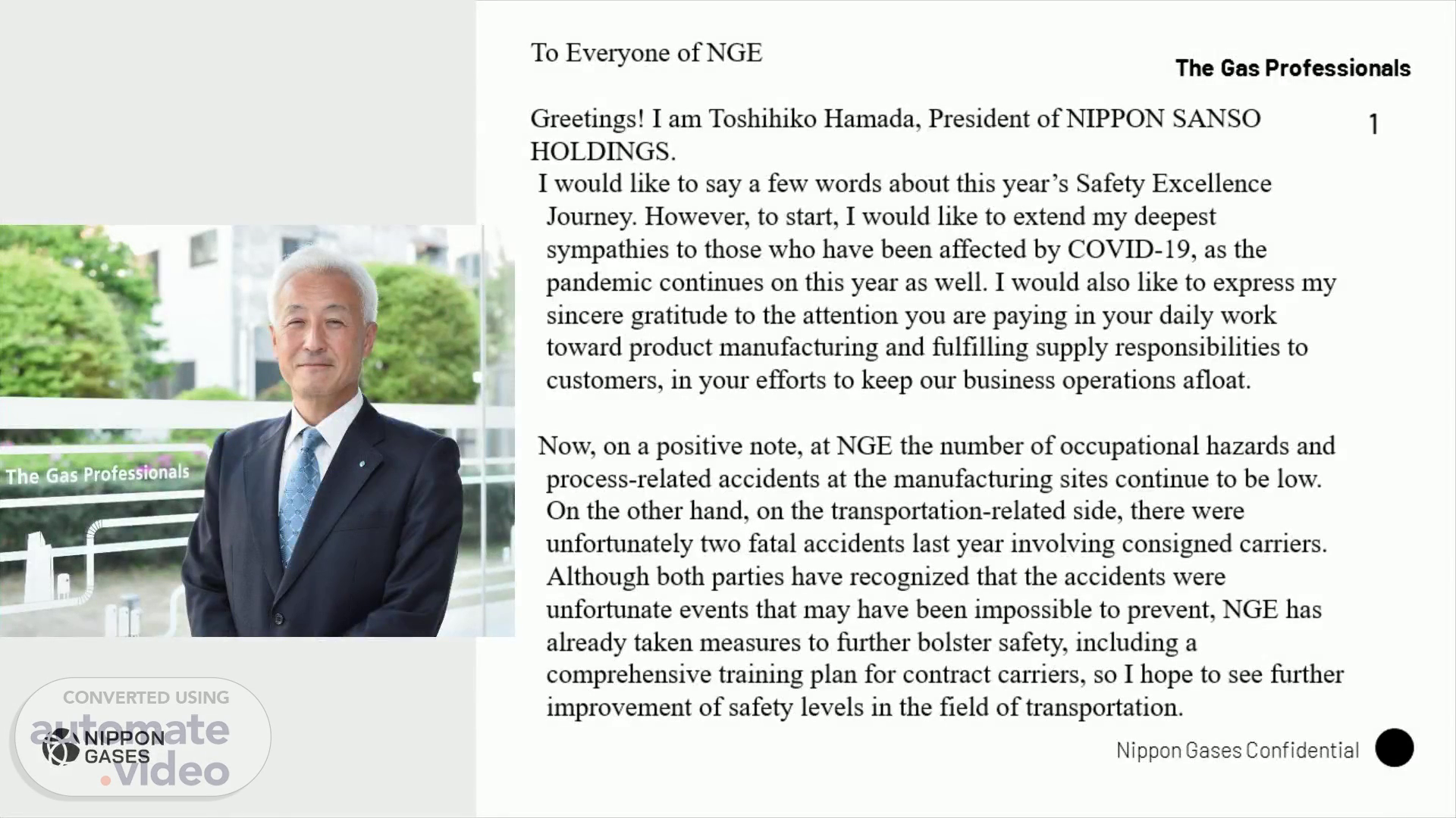 [Audio] To Everyone of NGE Greetings! I am Toshihiko Hamada, President of NIPPON SANSO HOLDINGS. I would like to say a few words about this year's Safety Excellence Journey. However, to start, I would like to extend my deepest sympathies to those who have been affected by COVID- 19, as the pandemic continues on this year as well. I would also like to express my sincere gratitude to the attention you are paying in your daily work toward product manufacturing and fulfilling supply responsibilities to customers, in your efforts to keep our business operations afloat. Now, on a positive note, at NGE the number of occupational hazards and <process-related accidents at the manufacturing sites continue to be low. On the other hand, on the transportation-related side, there were unfortunately two fatal accidents last year involving consigned carriers. Although both parties have recognized that the accidents were unfortunate events that may have been impossible to prevent, NGE has already taken measures to further bolster safety, including a comprehensive training plan for contract carriers, so I hope to see further improvement of safety levels in the field of transportation..