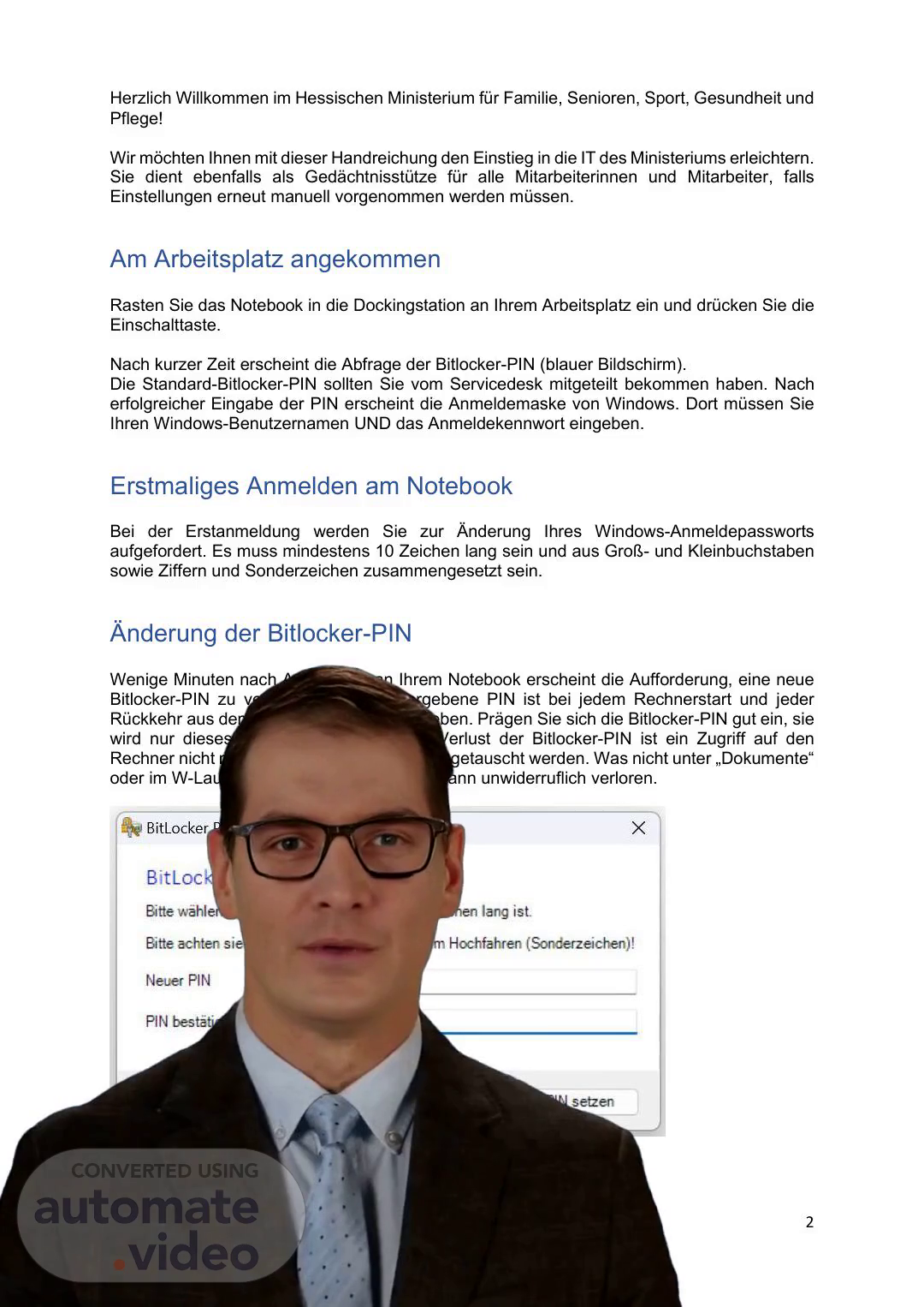 [Virtual Presenter] Die neue Notebooksetzung wird automatisch die erforderlichen Einstellungen für den ersten Mal benutzen. Sie müssen Ihre Windows-Login-Namen und -Passwort eingeben. Für das erste Mal werden Sie auch aufgefordert, eine neue Windows-Login-Passwort zu erstellen. Dieses Passwort sollte mindestens zehn Zeichen lang sein und sowohl Groß- als auch Kleinschrift, Zahlen und Sonderzeichen enthalten. Nach der Einrichtung des Windows-Login-Passworts erhalten Sie einen Antrag zur Erstellung eines neuen BitLocker-PINs. Dieser PIN wird verwendet, um das Notebook zu entsperren und kann nur einmal eingegeben werden. Bitte beachten Sie, dass wenn Sie dieses PIN verlieren, Sie Ihr Notebook nicht wieder zugänglich machen können. Alle Daten, die auf dem Notebook gespeichert sind, werden gelöscht, wenn es nicht zugänglich ist. Um dies zu vermeiden, sollten Sie sensible Dokumente außerhalb des Festplattenspeichers Ihres Notebooks speichern. Das Dockingstation am Arbeitsplatz wird Ihnen bei der Einrichtungsprozess helfen. Sie müssen einfach Ihren Laptop einstecken und den Power-Tasten drücken. Eine blaue Tastenschirm erscheint und bittet um den BitLocker-PIN. Sie müssen den von der Dienststelle bereitgestellten PIN eingeben. Dann müssen Sie sich mit Ihrem Login-Namen und -Passwort bei Windows anmelden. Stellen Sie sicher, dass Sie Ihr Windows-Login-Passwort sicher aufbewahren. Es wird empfohlen, den BitLocker-PIN regelmäßig zu ändern. Bitte beachten Sie, dass alle Daten, die auf dem Notebook gespeichert sind, gelöscht werden, wenn es nicht zugänglich ist. Sensitive Dokumente sollten außerhalb des Festplattenspeichers Ihres Notebooks gespeichert werden. Sie sollten immer die Anweisungen der Dienststelle befolgen..