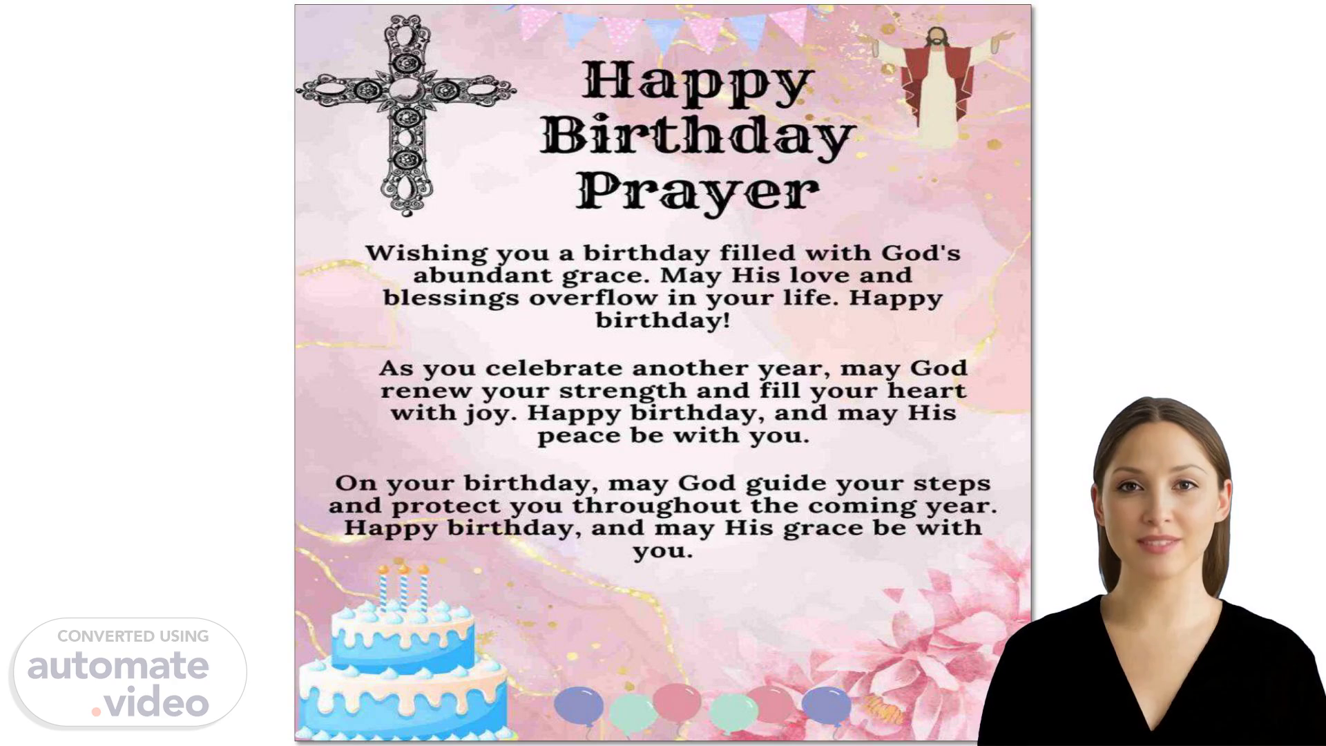 [Virtual Presenter] On this important day, we lift up a prayer for God's grace, love, blessings, strength, joy, peace, and guidance to encompass you. We come together to wish you a happy birthday, filled with the abundant love and grace of God. May you experience His overflowing blessings in your life and may this day be a celebration of your unwavering faith and devotion. As you reflect on the past year and look toward the future, may God renew your strength and fill your heart with joy. Let us rejoice in the remarkable individual that you are and the positive influence you have on those around you. Happy birthday, and may His peace be with you always. On this special day, we also pray for God's guidance and protection throughout the upcoming year. May His grace surround you and lead you towards a brighter and better future. As we honor your life and the blessings it brings, may you continue to walk in His light and spread His love to the world. Happy birthday, and may God's grace be with you always..