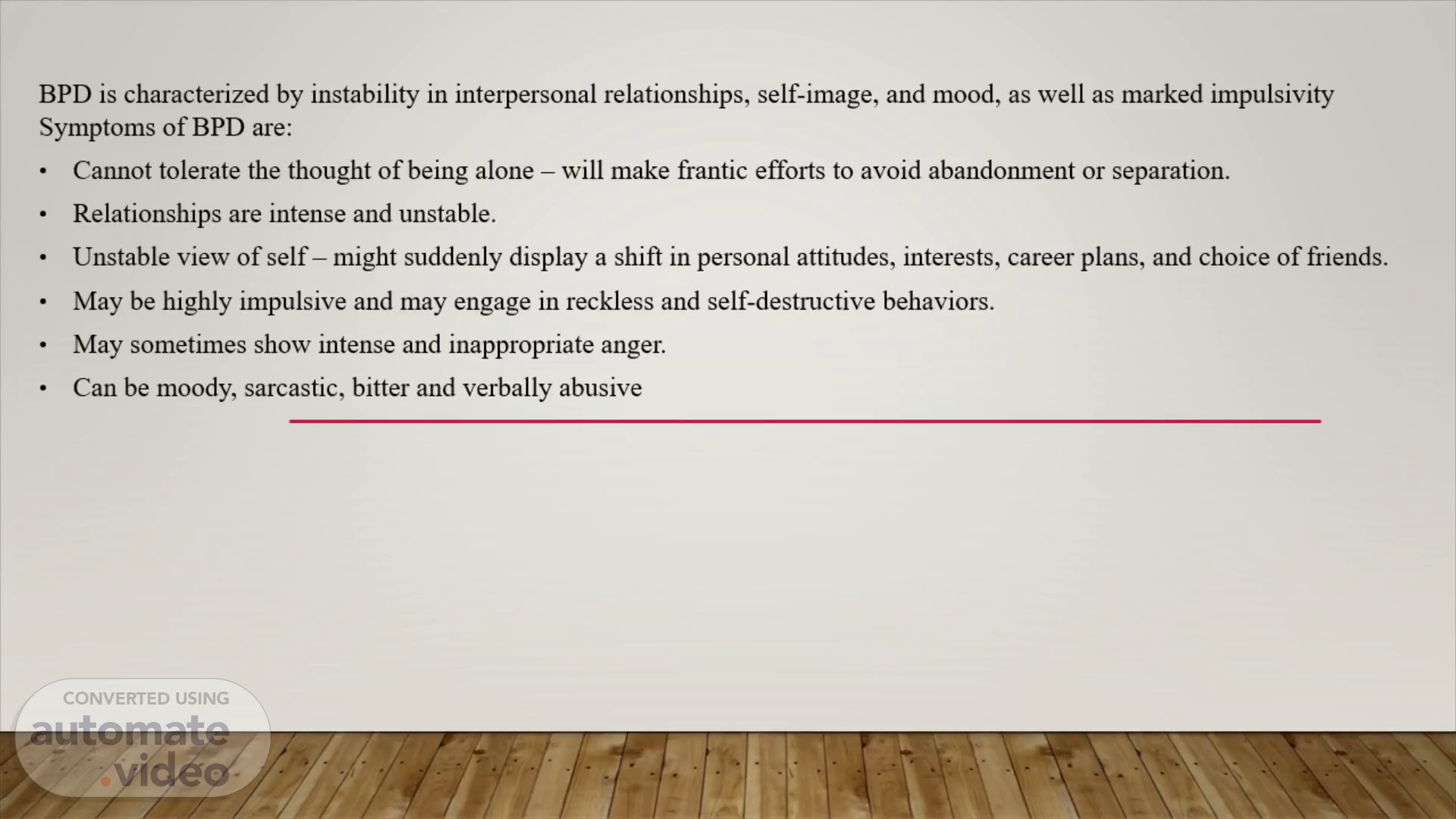 Borderline Personality Disorder. BPD is c haracterized by instability in interpersonal relationships, self-image, and mood, as well as marked impulsivity Symptoms of BPD are: Cannot tolerate the thought of being alone – will make frantic efforts to avoid abandonment or separation. Relationships are intense and unstable. Unstable view of self – might suddenly display a shift in personal attitudes, interests, career plans, and choice of friends. May be highly impulsive and may engage in reckless and self-destructive behaviors. May sometimes show intense and inappropriate anger. Can be moody, sarcastic, bitter and verbally abusive.