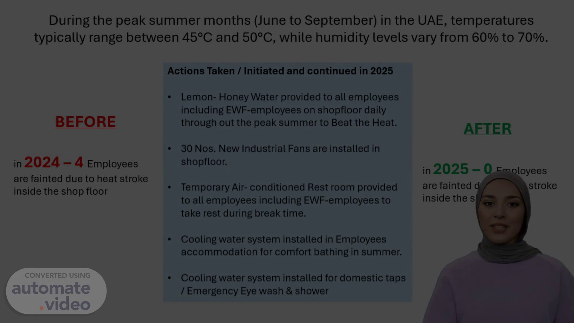 [Virtual Presenter] The company took several measures to address the extreme heat and humidity in the UAE during the summer of 2025. One of these measures was providing lemon-honey water to all employees daily, including those working in the Engineering and Works Force (EWF) department. New industrial fans were installed on the shop floor to create a cooler environment. Temporary air-conditioned restrooms were established for employees to take breaks and cool off during the hot weather. Cooling water systems were also installed for both employee accommodations and domestic use, making it easier for everyone to live comfortably. This resulted in zero reported cases of heat stroke among employees in 2025, which was an improvement from the previous year when four employees had fainted due to heat-related illnesses. The company's proactive approach to addressing this issue demonstrated its commitment to prioritizing employee well-being and safety..