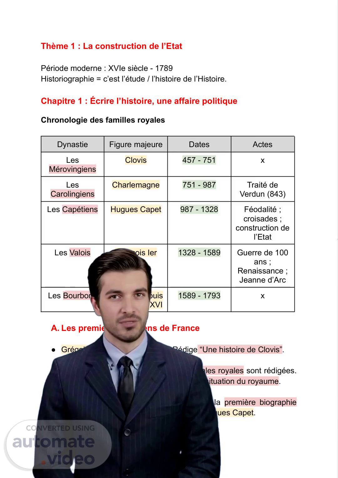 [Virtual Presenter] Le développement historique du État en France au cours du période moderne, depuis le XVIe siècle jusqu'à 1789, est marqué par des événements et des personnages historiques importants. Cette période a vu l'émergence des premiers historiens qui cherchaient à écrire l'histoire de leur temps. Un tel historien était Grégoire de Tours, qui a écrit "Un compte de Clovis" autour de 590. Un autre personnage notable était Helgaud de Fleury, qui a composé la biographie du roi Robert le Pieux, fils d'Hugues Capet, dans le XIe siècle. Ces historiens anciens ont joué un rôle crucial dans la formation de notre compréhension du passé. Ils ont documenté les dates clés, les événements et les personnages, fournissant des insights précieux sur le développement de l'État français. Leur travail a posé les fondations pour les générations futures d'historiens, nous permettant d'étudier les dynamiques complexes du période médiévale. En examinant ces comptes anciens, nous pouvons acquérir une connaissance plus profonde de l'évolution de la monarchie française et de son impact sur le paysage social, politique et culturel..