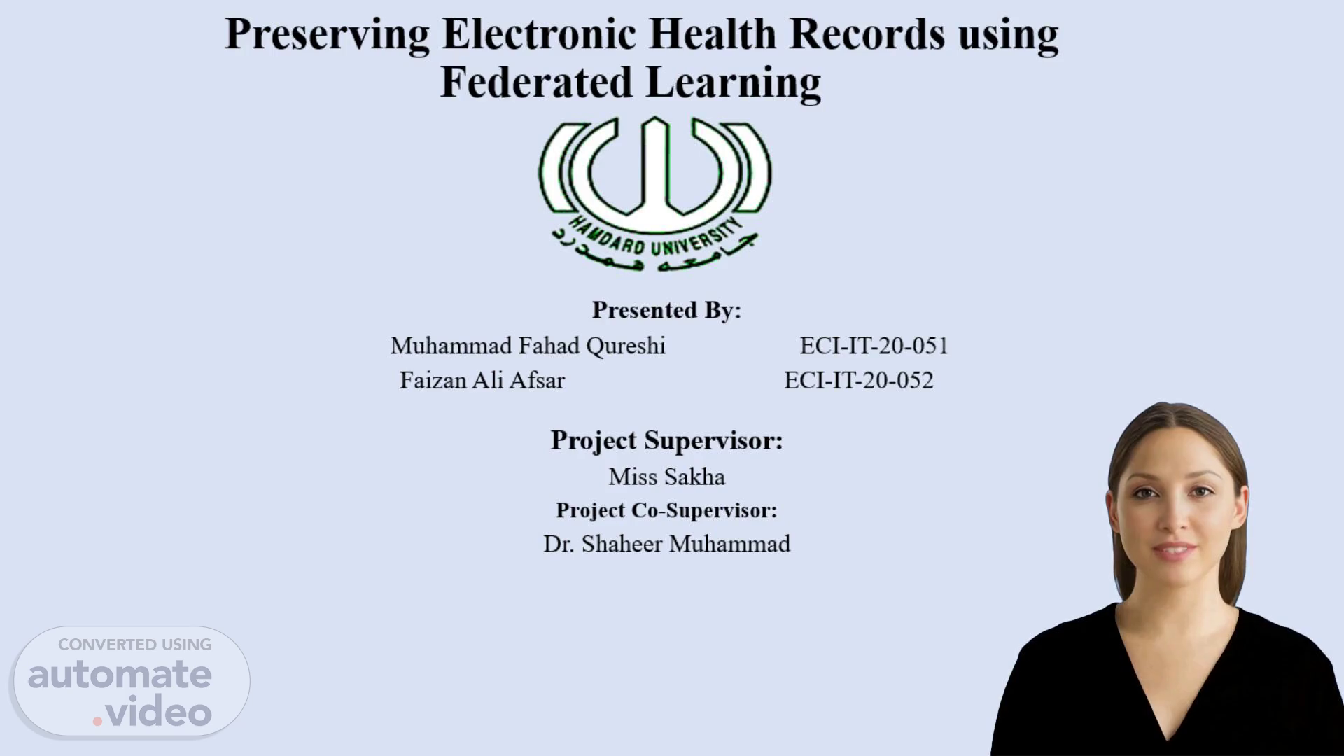 [Virtual Presenter] Preserving Electronic Health Records using Federated Learning Presented By: Muhammad Fahad Qureshi ECI-IT-20-051 Faizan Ali Afsar ECI-IT-20-052 Project Supervisor: Miss Sakha Project Co-Supervisor: Dr Shaheer Muhammad Department of Computing Faculty of Engineering Science & Technology Hamdard University Islamabad Campus.