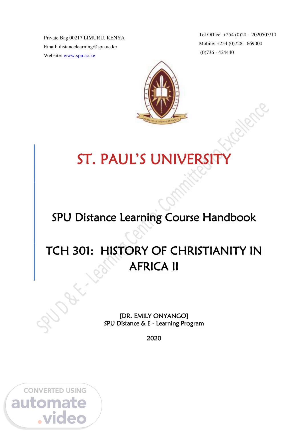[DR. EMILY ONYANGO] SPU Distance & E - Learning Program 2020 ST. PAUL’S UNIVERSITY SPU Distance Learning Course Handbook TCH 301: HISTORY OF CHRISTIANITY IN AFRICA II Private Bag 00217 LIMURU, KENYA Email: [email protected] Website: www.spu.ac.ke Tel Office: +254 (0)20 – 2020505/10 Mobile: +254 (0)728 - 669000 (0)736 - 424440.