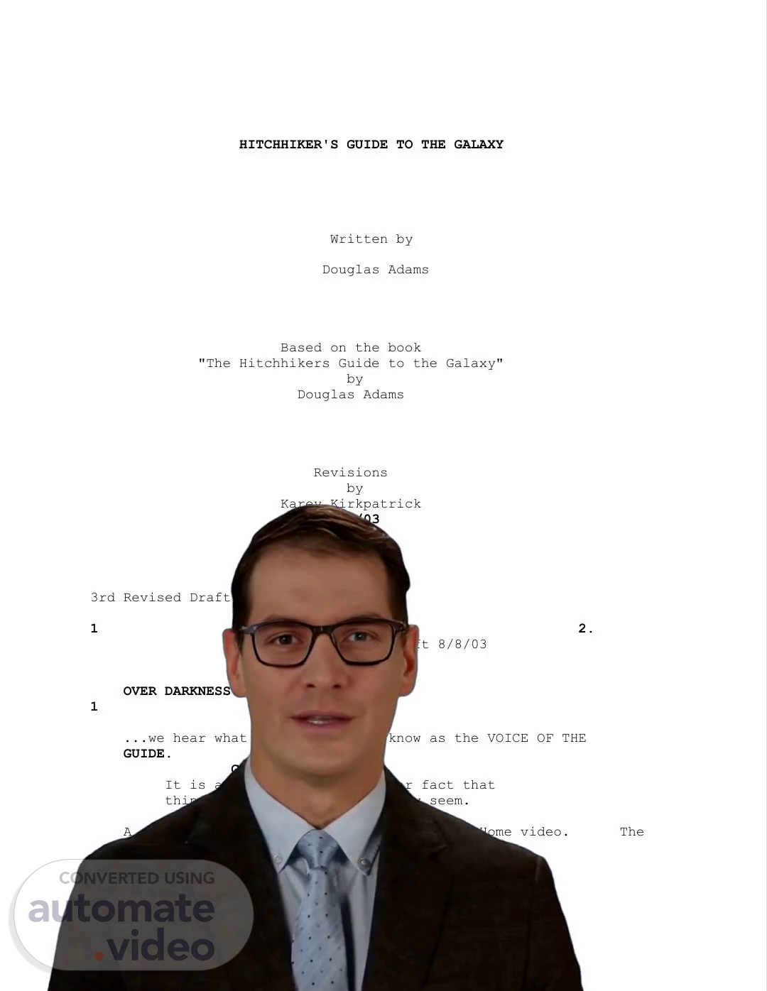 [Audio] Arthur:. FORD (O.S.) (American accent) Arthur! Arthur and Prosser turn to see a man cresting a hill, pushing a shopping cart which is filled with beer and bags of peanuts. This is FORD PREFECT. Wiry, intense. As he heads downhill, he leaps up and rides the cart down towards Arthur's house -- like a kid in a supermarket. He rolls right past Arthur and the bulldozers. ARTHUR Ford? He leaps off, drags the cart to a full stop. FORD Arthur! There you are. Here drink and eat with me. We need to talk. ARTHUR Er, um...now's not the best time, Ford They're going to demolish my home, FORD Whoa. You already know? How? Arthur simply motions to the bulldozer. (CONTINUED) 5 5. HHGG 3rd Revised Draft 8/8/03 CONTINUED: (2) 5 FORD (CONT'D) Oh. When you say "they" you mean they. Got it. Listen, I gotta tell you something important, and I gotta tell you now. ARTHUR But what about my house? Ford looks to Prosser who is conferring with the bulldozer driver. He pushes the cart over to him. ARTHUR - watches as Ford gestures to Prosser who waves his hand and the all the 'dozer engines die..