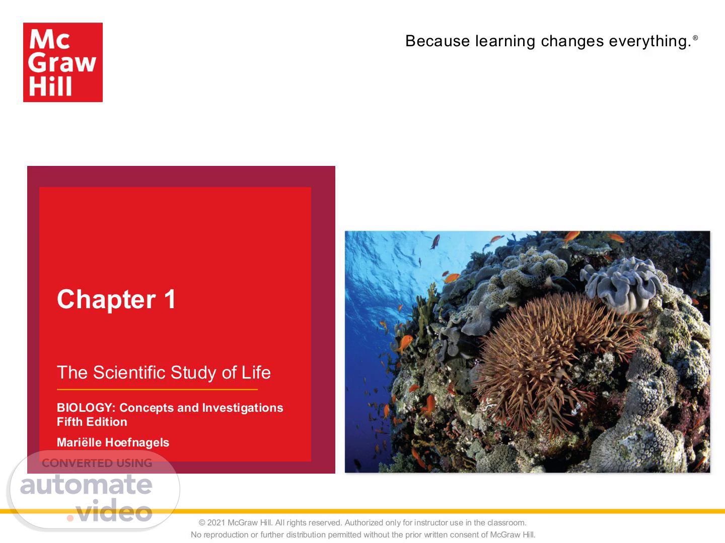 [Audio] ® Because learning changes everything. Chapter 1 The Scientific Study of Life BIOLOGY: Concepts and Investigations Fifth Edition Mariëlle Hoefnagels © 2021 McGraw Hill. All rights reserved. Authorized only for instructor use in the classroom. No reproduction or further distribution permitted without the prior written consent of McGraw Hill..