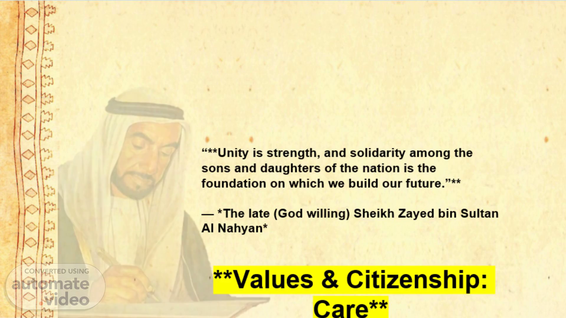 [image]. attachment. [image]. **“Unity is strength, and solidarity among the sons and daughters of the nation is the foundation on which we build our future.”** — *The late (God willing) Sheikh Zayed bin Sultan Al Nahyan* **Values & Citizenship: Care** ..