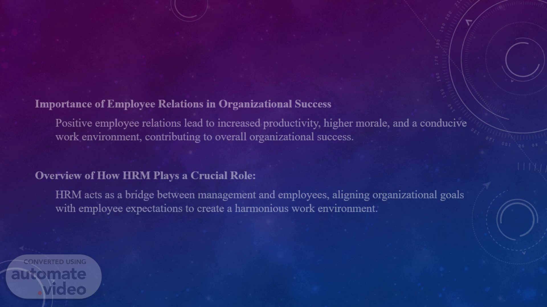 [Audio] Welcome to our presentation on the crucial role of Human Resource Management (HRM) in fostering positive employee relations. HRM, or Human Resource Management, is the strategic approach to managing an organization's most valuable asset—its people. Positive employee relations are essential for organizational success, contributing to increased productivity and a positive work environment. Let's explore how HRM plays a crucial role in achieving these goals..