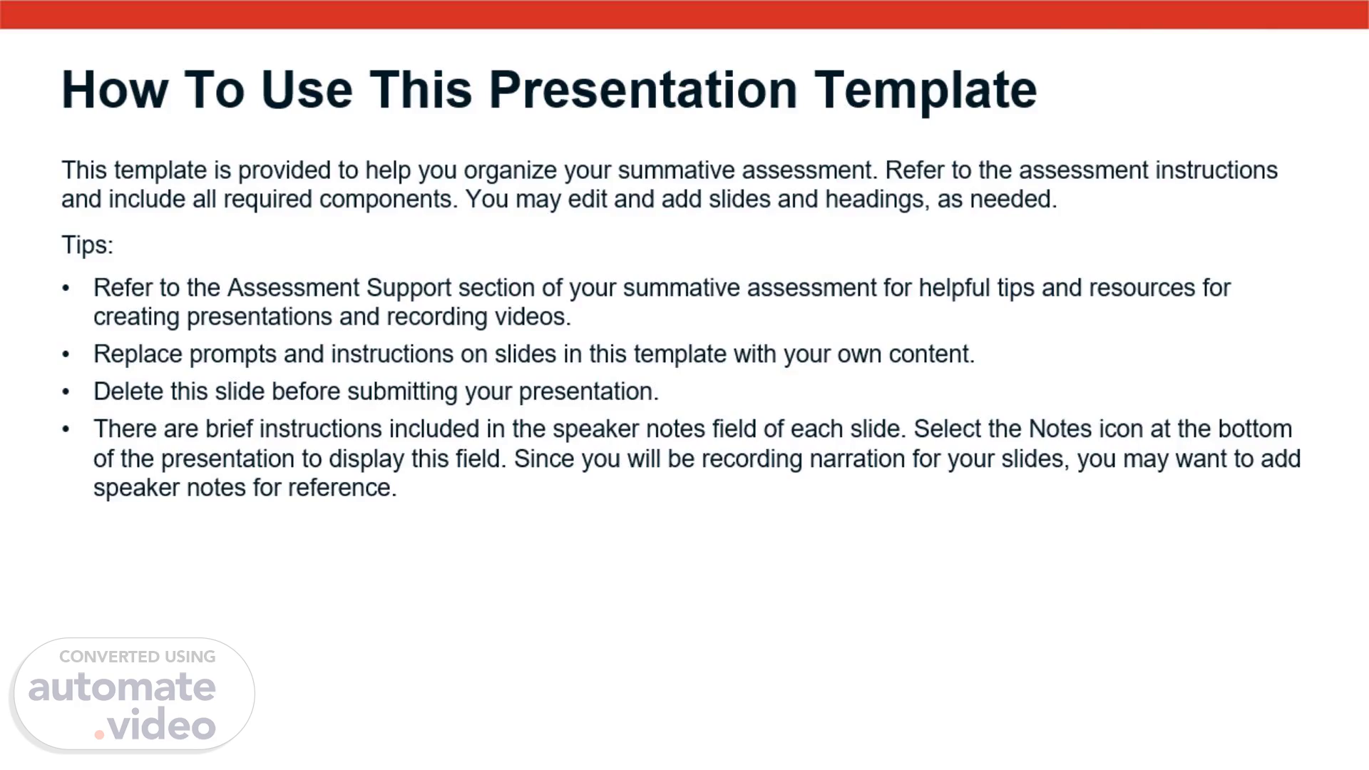 [Audio] Instructions: Customize the following placeholder fields on this slide: presentation title, course code, course title, summative assessment title, your name, your faculty member's name, and the date submitted. When finished, delete these instructions in the speaker notes..
