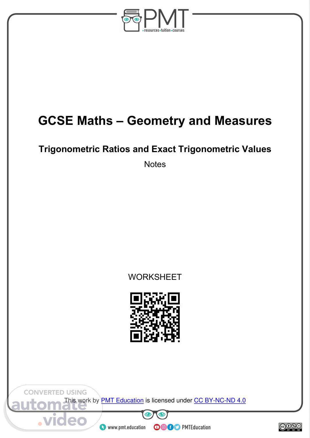 [Audio] GCSE Maths – Geometry and Measures Trigonometric Ratios and Exact Trigonometric Values Notes WORKSHEET https://bit.ly/pmt-edu-cc https://bit.ly/pmt-cc This work by PMT Education is licensed under CC BY-NC-ND 4.0 https://bit.ly/pmt-cc https://bit.ly/pmt-cc https://bit.ly/pmt-edu.