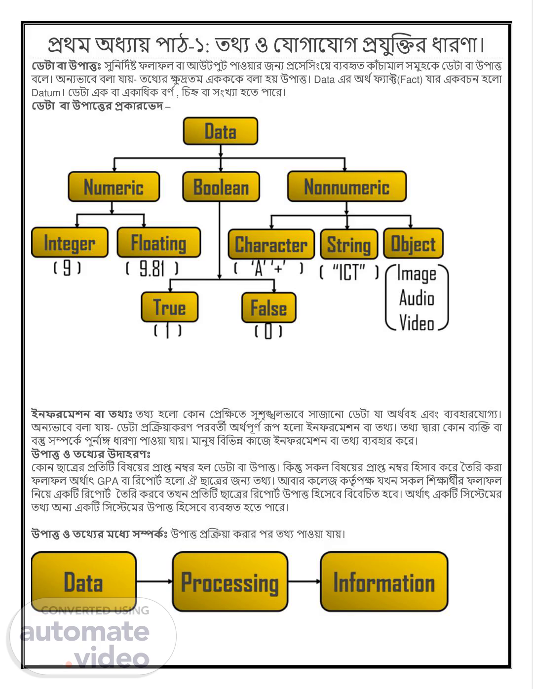 প্রথম অধ্যায় পাঠ-১: তথয ও য াগায াগ প্র ুক্তির ধ্ারণা। ডেটা বা উপাত্তঃ সুনিনদিষ্ট ফলাফল বা আউটপুট পাওয়ার জিয প্রযসনসিংযয় বযবহৃত কাাঁচামাল সমুহযক যেটা বা উপাত্ত বযল। অিযভাযব বলা ায়- তযথযর ক্ষু দ্রতম এককযক বলা হয় উপাত্ত। Data এর অথ ি ফযাক্ট(Fact) ার একবচি হযলা Datum। যেটা এক বা একানধ্ক বণ ি , নচহ্ন বা সিংখ্যা হযত পাযর। ডেটা বা উপাত্তত্তর প্রকারত্তেদ – ইনফরত্তেশন বা তথ্যঃ তথয হযলা যকাি যপ্রনক্ষযত সুশৃঙ্খলভাযব সাজাযিা যেটা া অথ িবহ এবিং বযবহারয াগয। অিযভাযব বলা ায়- যেটা প্রক্তিয়াকরণ পরবতী অথ িপূণ ি রূপ হযলা ইিফরযমশি বা তথয। তথয দ্বারা যকাি বযক্তি বা বস্তু সম্পযকি পুি িাঙ্গ ধ্ারণা পাওয়া ায়। মািুষ নবনভন্ন কাযজ ইিফরযমশি বা তথয বযবহার কযর। উপাত্ত ও তত্তথ্যর উদাহরণঃ যকাি ছাযের প্রনতটট নবষযয়র প্রাপ্ত িম্বর হল যেটা বা উপাত্ত। নকন্তু সকল নবষযয়র প্রাপ্ত িম্বর নহসাব কযর ততনর করা ফলাফল অথ িাৎ GPA বা নরযপাটি হযলা ঐ ছাযের জিয তথয। আবার কযলজ কতৃ িপক্ষ খ্ি সকল নশক্ষাথীর ফলাফল নিযয় একটট নরযপাটি ততনর করযব তখ্ি প্রনতটট ছাযের নরযপাটি উপাত্ত নহযসযব নবযবনচত হযব। অথ িাৎ একটট নসযেযমর তথয অিয একটট নসযেযমর উপাত্ত নহযসযব বযবহৃত হযত পাযর। উপাত্ত ও তত্তথ্যর েত্তযয সম্পককঃ উপাত্ত প্রক্তিয়া করার পর তথয পাওয়া ায়।.