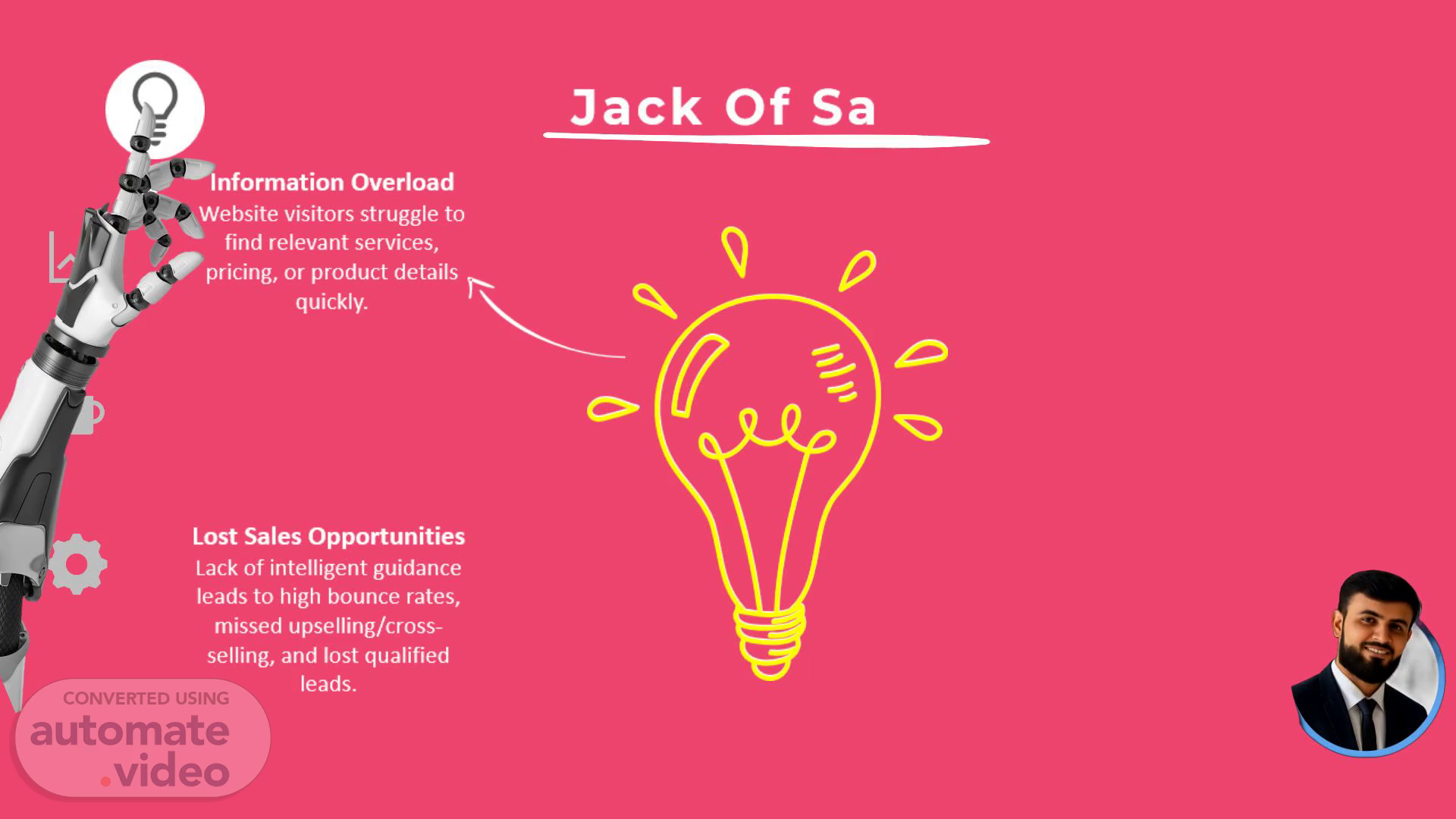 Lightbulb Jack Of Sales Disconnected Sales Process Absence of easy scheduling and instant proposal generation slows down conversions and reduces R-O-I-. Information Overload Website visitors struggle to find relevant services, pricing, or product details quickly. Upward trend Coffee Lost Sales Opportunities Lack of intelligent guidance leads to high bounce rates, missed upselling/cross selling, and lost qualified leads. Single gear Weak Engagement & Conversion No real time human like interaction causes prospects to abandon websites without taking meaningful actions. Users.