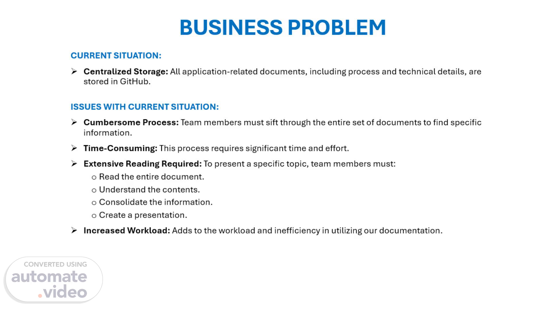 [Audio] We work for an application named IBM Executive Advocate Program(IEAP). IEAP is a service designed for large and strategic clients and partners, providing a senior executive advocate to build strategic partnerships, strengthen relationships, and explore new business opportunities within IBM's portfolio. Our application related documents are stored in Github. It covers functional, process, and technical details. If we need to find any specific details from that team members must sift through the entire set of documents to find specific information, which is time consuming and increases workload..