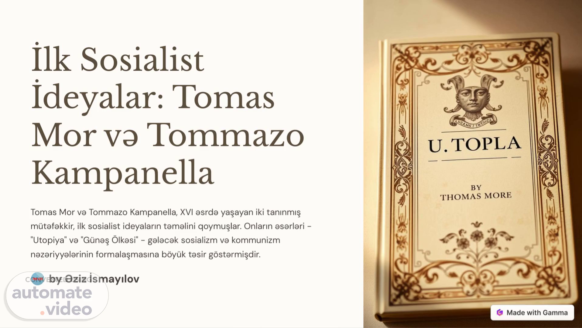 İlk Sosialist İdeyalar: Tomas Mor və Tommazo Kampanella Tomas Mor və Tommazo Kampanella, XVI əsrdə yaşayan iki tanınmış mütəfəkkir, ilk sosialist ideyaların təməlini qoymuşlar. Onların əsərləri - "Utopiya" və "Günəş Ölkəsi" - gələcək sosializm və kommunizm nəzəriyyələrinin formalaşmasına böyük təsir göstərmişdir. by Əziz İsmayılov.