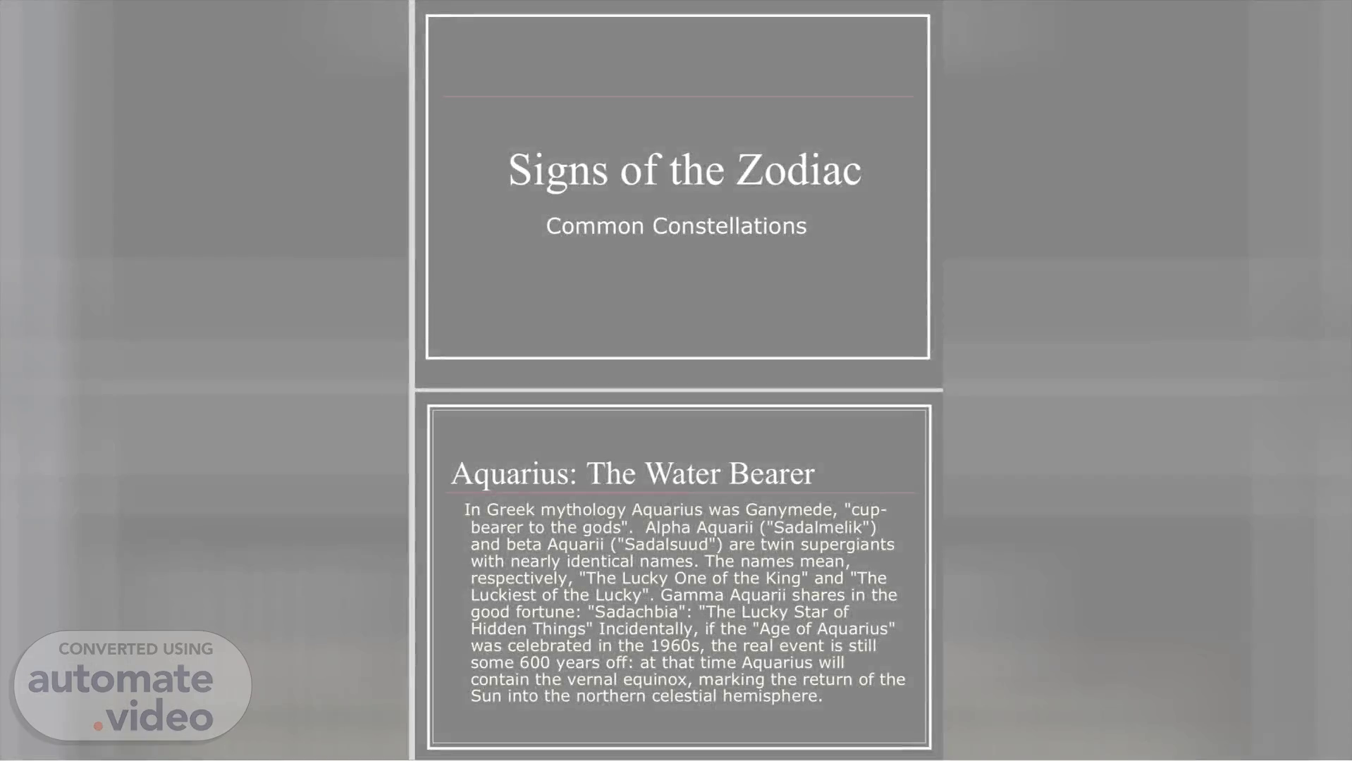 [Audio] . Signs of the Zodiac Common Constellations Aquarius: The Water Bearer In Greek mythology Aquarius was Ganymede, "cup- bearer to the gods". Alpha Aquarii ("Sadalmelik") and beta Aquarii ("Sadalsuud") are twin supergiants with nearly identical names. The names mean, respectively, "The Lucky One of the King" and "The Luckiest of the Lucky". Gamma Aquarii shares in the good fortune: "Sadachbia": "The Lucky Star of Hidden Things" Incidentally, if the "Age of Aquarius" was celebrated in the 1960s, the real event is still some 600 years off: at that time Aquarius will contain the vernal equinox, marking the return of the Sun into the northern celestial hemisphere..