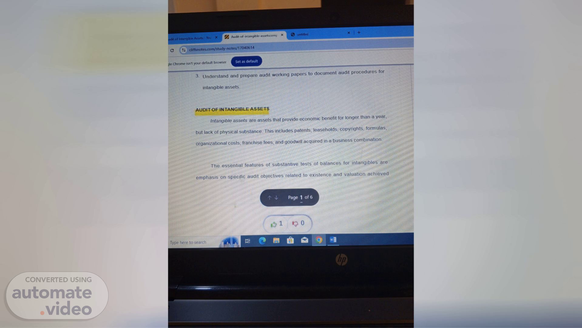 kita Assets- X C c%notescom/study-notes/1704.Ch 14 Set as default Ile (frome isnt ycnar default browser 3, Understand and prepare audit working papers to document audit procedures for intangible assets _ AUDIT OF IN TANGIBLE ASSETS Intangible assets are assets that provide economic benefit for longer than a year, but lack of physical substance. This includes patents, leaseholds, copyrights, formulas, organizational costs, franchise fees, and goodwill acquired in a business combination. The essential features of substantive tests of balances tor intangibles are emphasis on specific audit objectives related to existence and valuation achieved Page I of 6 here to search.