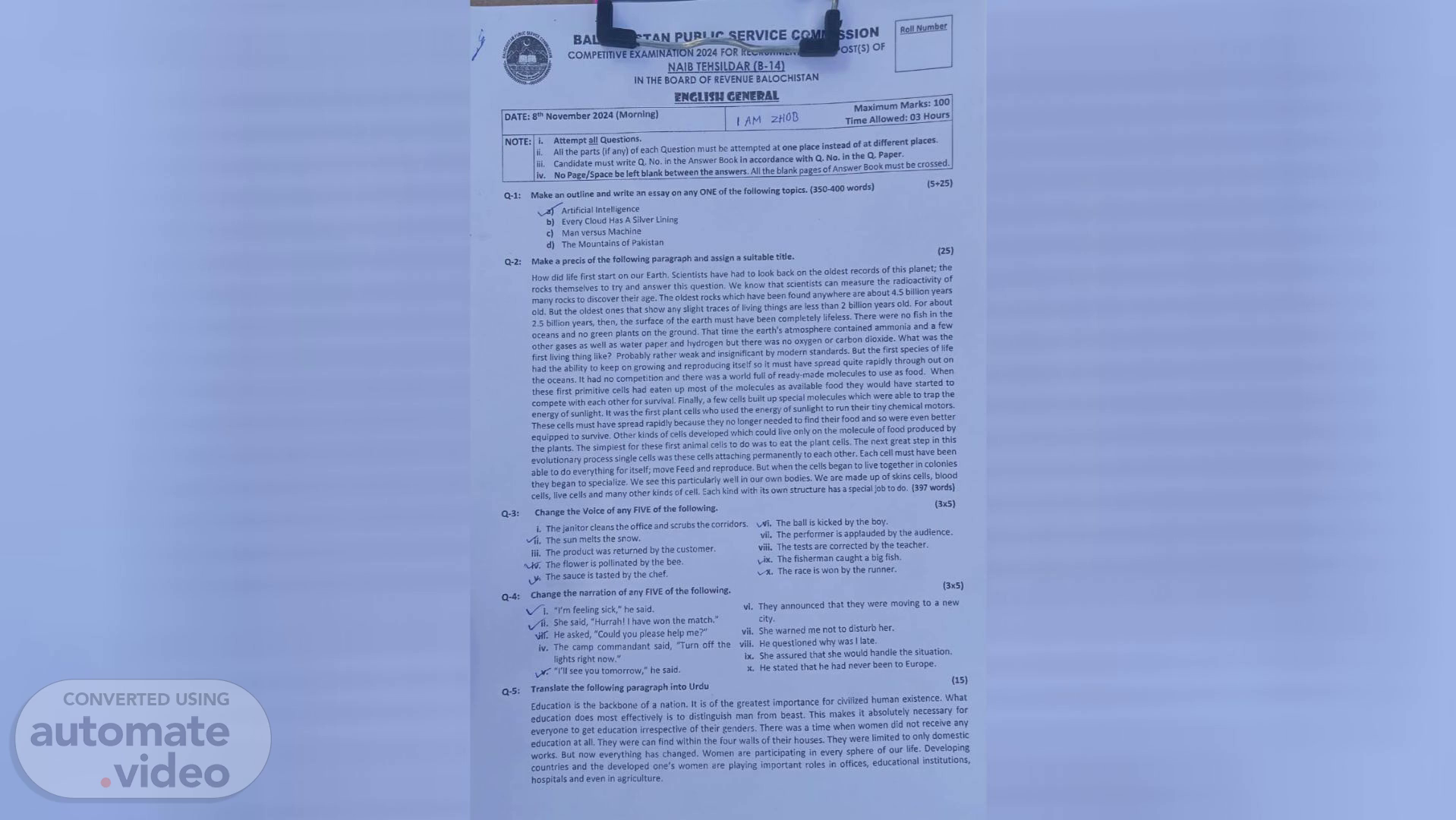 [Audio] . COMPETITIVE EXAMI PUP' RVICE C 2024 FOR AIBT SILDA B.I IN THE BOARD OF REVENUE BALOCHISTAN DATE: 8"' November 2024 (Morning) I zt10D NOTE: i. Attempt Questor'S. SION OST(S) OF Maximum Marks: 100 Time Allowed: 03 Hours ii. All the parts (if any) ot each Question must be attempted at one instead Of at different places. iii. Candidate must write Q. NO. in the Answer Bock in accordance with Q. No. in the Q. Paper. iv. No e/S Seleftblankbetween the answers. All the blank ofAnswer Bookmustbecrossed. Make an outline and write an essay on any ONE of the following topics. 050-400 words) Intel' igence b) Every Cloud Has A Silver Lining c) Man versus Machine d) The Mountains of Pakistan Make a precis of the following paragraph and assign a suitable title. (5.25) (25) HOW did life first start on our Earth. Scientists have had to look back on the oldest records Of this planet; the rocks to try and answer this question. We know that scientists can measure the radioactivity of many rocks to discover their The oldest rocks which have been found anywhere are about billion years Old, But the Oldest ones that show any slight traces Of living things are less than 2 billion vears Old, For about 2.5 billion years. then, the Surface Of the earth must have tken completely lifeless. There were no fish in the oceans and no green plants on the ground. That time the earth's atmosphere contained ammonia and a few Other gases as we" as water paper and hydrogen but there was no oxygen or carbon dioxide. What was the first living thing Probably rather weak and irsigmffcantby modem standards. But the first species Of life had the abi'ity to keep On growing and reproducing itself So it must have spread quite rapidly through Out on the Oceans. It had no competition anc there was a world full Of ready-made molecu'es to use as food. When these first primitive cens had eaten up most the molecules as available 'cod thev would have started to Compete with each other for survival, Finally, few cells built up special molecules which were abte to trap the energy o' sunlight. It was the first plant cells who used the enetgv of sunlight to run their tiny chemical motors. These cells must have spread rapid'} Epcause they no longer needed to find their food and so were even better equipped to survive Other kinds of cells developed which could live onw on the molecule of food produced by the plants. The simplest for these first animal to do was to eat the plant cells. The next great step in this evolutionary process single cells was these cells attaching permanently to each Other. Each cell must have been able to do everything for itself; move Feed and reproduce, But when the cells began to live together in colonies thev began to specialize. We see this particularib' well in Our own bodies. We are made up of skins cells, blood cells. live cells and many other kinds Of cell. Each kind With its Own Structure has a special lob to do. (397 words) Q-3: Change the Voice of any FIVE Of the following. i. The janitor the Office and scrubs the corridors. Vfi. The sun melts the snow. iii. The product was returned by the customer, The flower is pollinated by the bee. The sauce is tasted the chef. Q•4: Change the narration of any FIVE 01 the following. vil. viii. (3x5) The ball E kicked by the boy. The performer is applauded by the audience. The tests are corrected b/ the teacher. The fisherman caught a big fish. The race is won by the runner. (3,5) •rm feeling sick." he said. V/ii. She said, • Hurrah! have won the match," •J. He asked, "Could you please help iv. The camp commandant said, -Turn Off the lights right now." .vMf "I'll See you tomorrow," he said. Translate the following paragraph into Urdu VI. They announced that they were moving to a new cit}. She warned me rot to disturb her. vii. Viji. He questioned why was late. 'x. She assured that she would handle the situation. x. He stated thet he had never been to Europe. (15) Education is the backbone of a nation. It is of the greatest importance for civilized human existence. What education does most effectivetv is to distinguish man from beast. This makes it absolutely necessary for everyone to get education irrespective of their genders. There was a time when women did not receive any education at all. They were can find within the iour walls of their houses. They were limited to only domestic works. But now everything has changed, Women are participating in every sphere of Our life. Developing countries and the developed one's women ere playing important roles in offices, educational institutions, hospitals and even in agriculture..