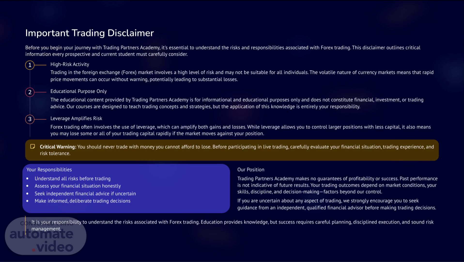 [Virtual Presenter] Important Trading Disclaimer Before you begin your journey with Trading Partners Academy, it's essential to understand the risks and responsibilities associated with Forex trading. This disclaimer outlines critical information every prospective and current student must carefully consider. 1 High-Risk Activity Trading in the foreign exchange (Forex) market involves a high level of risk and may not be suitable for all individuals. The volatile nature of currency markets means that rapid price movements can occur without warning, potentially leading to substantial losses. 2 Educational Purpose Only The educational content provided by Trading Partners Academy is for informational and educational purposes only and does not constitute financial, investment, or trading advice. Our courses are designed to teach trading concepts and strategies, but the application of this knowledge is entirely your responsibility. 3 Leverage Amplifies Risk Forex trading often involves the use of leverage, which can amplify both gains and losses. While leverage allows you to control larger positions with less capital, it also means you may lose some or all of your trading capital rapidly if the market moves against your position. Critical Warning: You should never trade with money you cannot afford to lose. Before participating in live trading, carefully evaluate your financial situation, trading experience, and risk tolerance. Your Responsibilities Our Position Understand all risks before trading Assess your financial situation honestly Trading Partners Academy makes no guarantees of profitability or success. Past performance is not indicative of future results. Your trading outcomes depend on market conditions, your skills, discipline, and decision-making—factors beyond our control. Seek independent financial advice if uncertain Make informed, deliberate trading decisions If you are uncertain about any aspect of trading, we strongly encourage you to seek guidance from an independent, qualified financial advisor before making trading decisions. It is your responsibility to understand the risks associated with Forex trading. Education provides knowledge, but success requires careful planning, disciplined execution, and sound risk management..