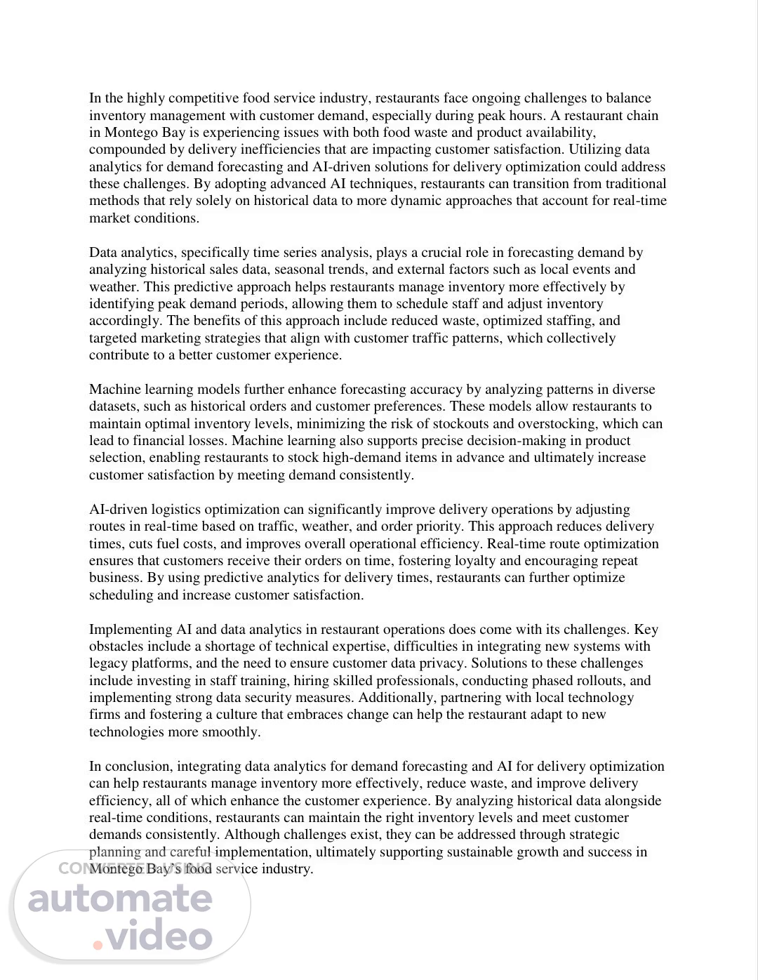 In the highly competitive food service industry, restaurants face ongoing challenges to balance inventory management with customer demand, especially during peak hours. A restaurant chain in Montego Bay is experiencing issues with both food waste and product availability, compounded by delivery inefficiencies that are impacting customer satisfaction. Utilizing data analytics for demand forecasting and AI-driven solutions for delivery optimization could address these challenges. By adopting advanced AI techniques, restaurants can transition from traditional methods that rely solely on historical data to more dynamic approaches that account for real-time market conditions. Data analytics, specifically time series analysis, plays a crucial role in forecasting demand by analyzing historical sales data, seasonal trends, and external factors such as local events and weather. This predictive approach helps restaurants manage inventory more effectively by identifying peak demand periods, allowing them to schedule staff and adjust inventory accordingly. The benefits of this approach include reduced waste, optimized staffing, and targeted marketing strategies that align with customer traffic patterns, which collectively contribute to a better customer experience. Machine learning models further enhance forecasting accuracy by analyzing patterns in diverse datasets, such as historical orders and customer preferences. These models allow restaurants to maintain optimal inventory levels, minimizing the risk of stockouts and overstocking, which can lead to financial losses. Machine learning also supports precise decision-making in product selection, enabling restaurants to stock high-demand items in advance and ultimately increase customer satisfaction by meeting demand consistently. AI-driven logistics optimization can significantly improve delivery operations by adjusting routes in real-time based on traffic, weather, and order priority. This approach reduces delivery times, cuts fuel costs, and improves overall operational efficiency. Real-time route optimization ensures that customers receive their orders on time, fostering loyalty and encouraging repeat business. By using predictive analytics for delivery times, restaurants can further optimize scheduling and increase customer satisfaction. Implementing AI and data analytics in restaurant operations does come with its challenges. Key obstacles include a shortage of technical expertise, difficulties in integrating new systems with legacy platforms, and the need to ensure customer data privacy. Solutions to these challenges include investing in staff training, hiring skilled professionals, conducting phased rollouts, and implementing strong data security measures. Additionally, partnering with local technology firms and fostering a culture that embraces change can help the restaurant adapt to new technologies more smoothly. In conclusion, integrating data analytics for demand forecasting and AI for delivery optimization can help restaurants manage inventory more effectively, reduce waste, and improve delivery efficiency, all of which enhance the customer experience. By analyzing historical data alongside real-time conditions, restaurants can maintain the right inventory levels and meet customer demands consistently. Although challenges exist, they can be addressed through strategic planning and careful implementation, ultimately supporting sustainable growth and success in Montego Bay’s food service industry..