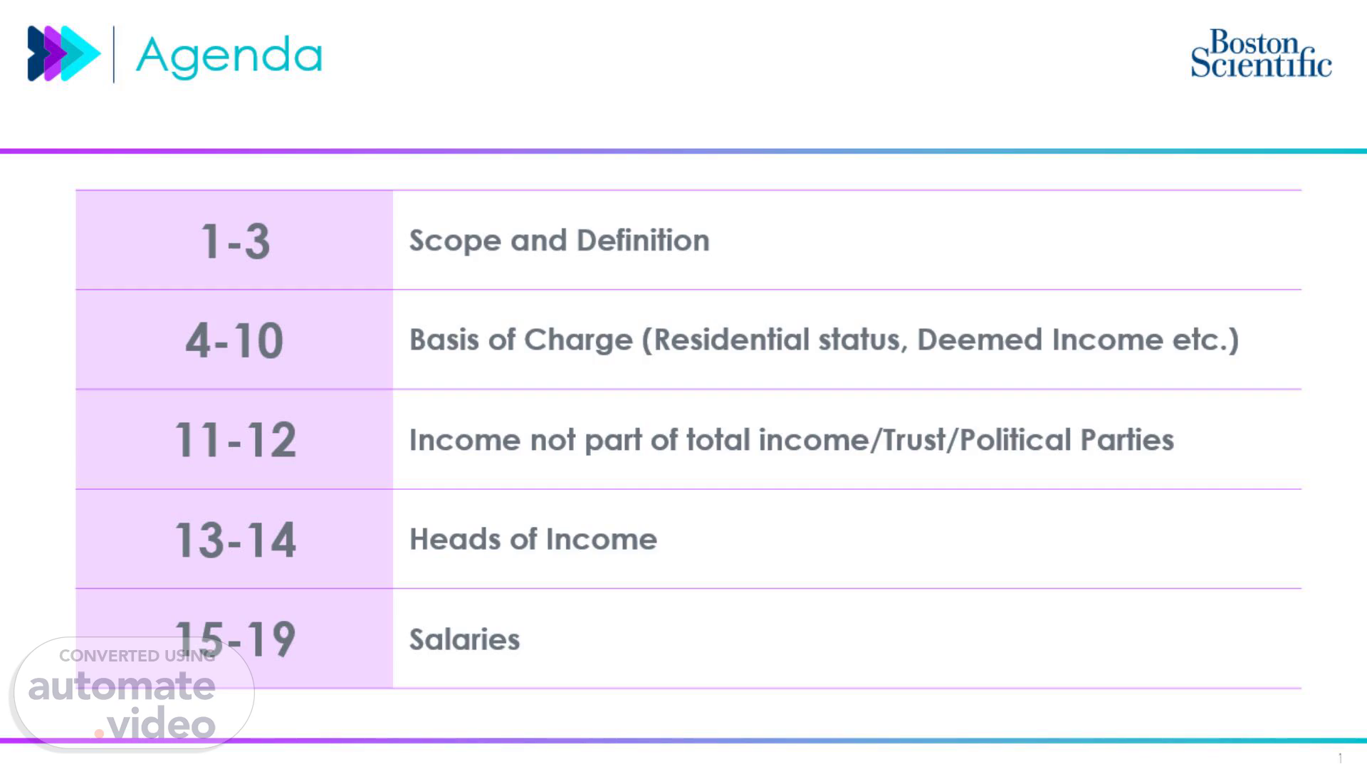 Agenda. 1. 1-3 Scope and Definition 4-10 Basis of Charge (Residential status, Deemed Income etc.) 11-12 Income not part of total income/Trust/Political Parties 13-14 Heads of Income 15-19 Salaries.