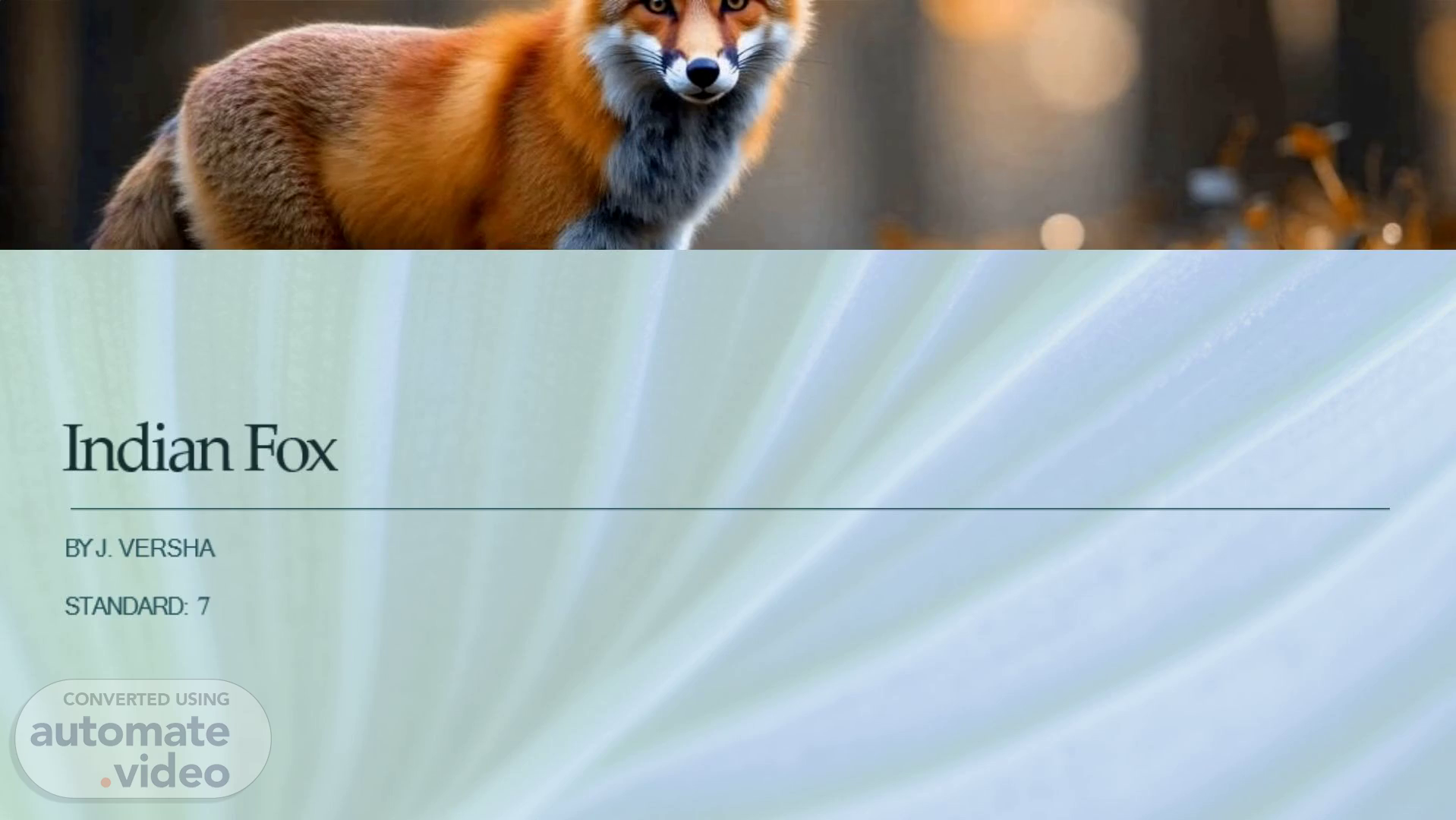 [Audio] As we reach the conclusion of our presentation, let us take a moment to discuss the Indian Fox. This species is exclusively found in the plains of India and is also referred to as the Bengal Fox. Despite its small size, the Indian Fox is a highly versatile animal, able to thrive in various habitats such as grasslands, forests, and even urban areas. Their resourceful nature enables them to adapt to the ever-changing landscape of modern-day India. The Indian Fox is a solitary creature, choosing to hunt alone and avoiding competition with other predators. They primarily feed on insects, small mammals, and birds, making them crucial for maintaining a balanced ecosystem. Although small, they possess intelligence and flexibility, making them a valuable addition to the diverse wildlife of India. As a final remark, our presentation comes to an end. We hope you have gained some new and interesting knowledge about the Indian Fox. Thank you for your time and attention..