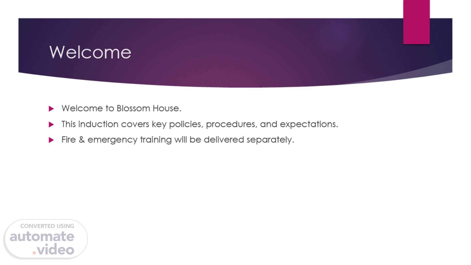 Welcome. Welcome to Blossom House. This induction covers key policies, procedures, and expectations. Fire & emergency training will be delivered separately..