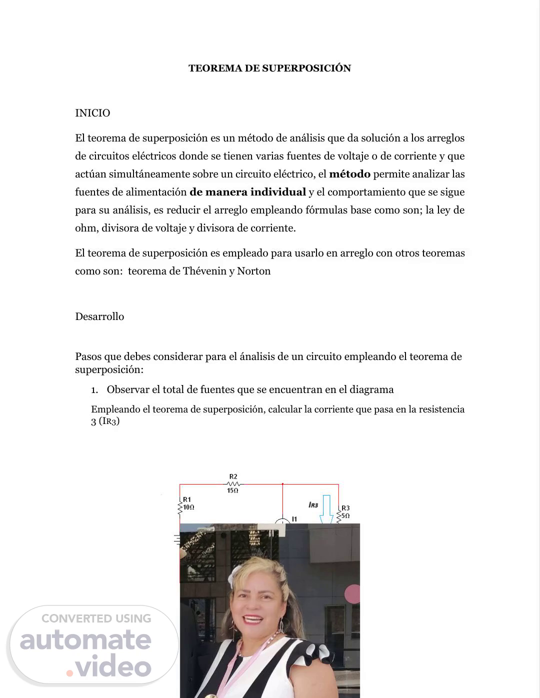 [Audio] El teorema de superposición es una técnica fundamental en el análisis de circuitos eléctricos complejos. Nos permite descomponer un problema con varias fuentes en diagramas más simples con una sola fuente activa, facilitando así la determinación de corrientes y voltajes en cualquier punto del circuito. Para aplicar este teorema, es necesario seguir ciertos pasos: observar las fuentes en el diagrama y calcular la corriente en una resistencia utilizando fórmulas básicas como la ley de Ohm y los divisores de voltaje y corriente. Luego, se combinan los resultados para obtener la corriente total en la resistencia. Esta técnica no solo simplifica los cálculos, sino que también nos brinda una comprensión profunda de cómo cada fuente individual contribuye al comportamiento general del circuito. Además, el teorema de superposición se integra con otros métodos de análisis, como los teoremas de Thévenin y Norton, fundamentales en el desarrollo de circuitos. Esto nos permite enfrentar una amplia gama de desafíos en el diseño y solución de problemas en Ingeniería. En resumen, el teorema de superposición es una herramienta poderosa para analizar circuitos eléctricos complejos y comprender su funcionamiento con detalle. Gracias a su metodología, podemos simplificar problemas complicados y obtener resultados precisos. Con los conocimientos adquiridos en esta presentación, podrán enfrentar con éxito cualquier reto en el mundo de la Ingeniería. A continuación, se presentará una demostración aplicando el teorema de superposición. Muchas gracias..