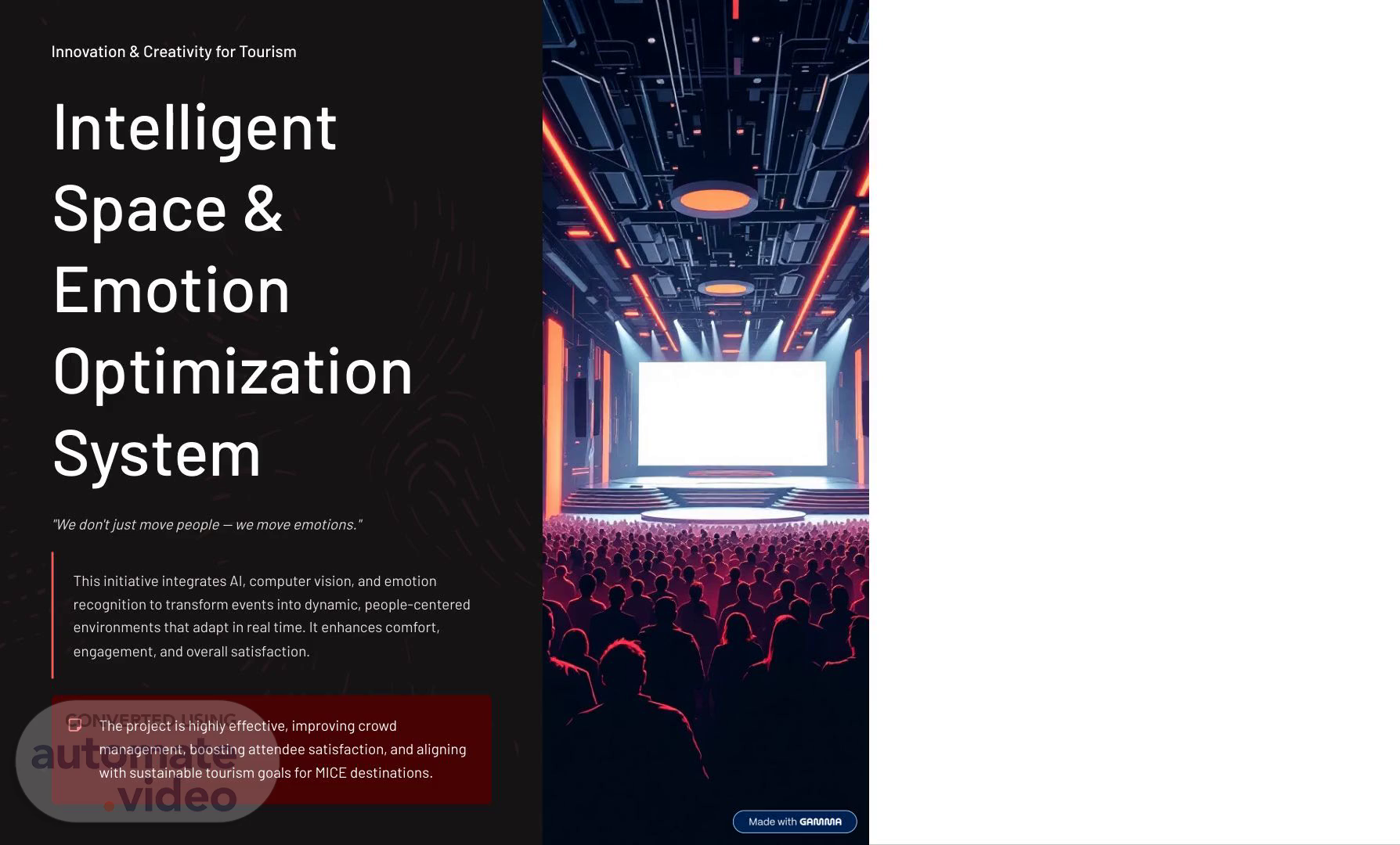 [Audio] Innovation & Creativity for Tourism Intelligent Space & Emotion Optimization System "We don't just move people 4 we move emotions." This initiative integrates AI, computer vision, and emotion recognition to transform events into dynamic, people-centered environments that adapt in real time. It enhances comfort, engagement, and overall satisfaction. The project is highly effective, improving crowd management, boosting attendee satisfaction, and aligning with sustainable tourism goals for MICE destinations..