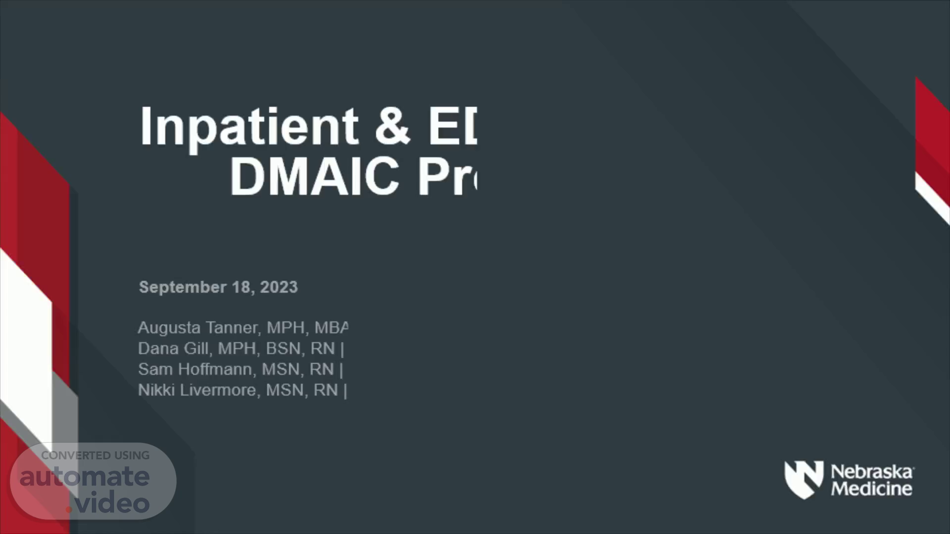 [Audio] We are proud to have worked with an exceptionally talented and passionate group of people throughout the scoping and quick win process of our project to reduce falls in inpatient and ED at Nebraska Medicine. We would like to express our gratitude to the sponsors and owners who provided valuable feedback, guidance and considerable support. Our appreciation also goes to the project team for their remarkable expertise, insight and hard work. A special thank you to Sue Nuss, Micah Beachy, Dawn Straub, Angie Boesch, Dr. Scott Diesing, Lauren Hood, Tamera Fandrich, Tammy Winterboer, Augusta Tanner, Michelle Freeman, Dana Gill, Keri Leach, Natalie McCready, Nikki Livermore, Sam Hoffmann, Amy Mead, Sarah Clark, Arien Gallegos, Emily Morrissey, Dani Schulz, Erin Harold, Brooke Brown, Jamie Peterson, Tiffany Whitney, Kate Buehler, Kellie Clapper, Josh Cunningham, Emily Morrissey, Brian Lake, Marla Melgoza, Ashley Liess, Sarah Swistak and Cassie Smith. Your dedication and commitment to making this project a success are greatly appreciated..