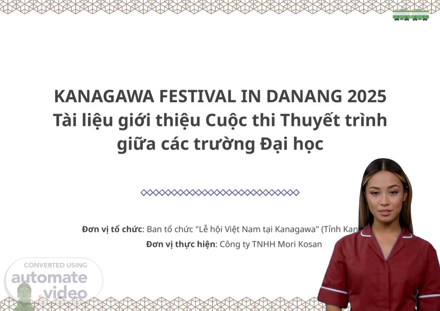 [Audio] Bài giảng hôm nay sẽ là phần tiếp theo trong dự án Festival Kanagawa năm 2025 sẽ được tổ chức tại Đà Nẵng. Đây là dự án do Ủy ban Festival Việt Nam tại Kanagawa tổ chức và công ty Mori Kosan Co., Ltd thực hiện. Trên slide thứ 2, chúng ta sẽ cùng tìm hiểu về thông tin khái quát của cuộc thi hùng biện giữa các trường học. Mục tiêu của cuộc thi là giúp học sinh hiểu rõ hơn về sự hấp dẫn của tỉnh Kanagawa cũng như môi trường du học và làm việc tại đây, đồng thời rèn luyện kỹ năng diễn đạt và thể hiện bản thân. Đối tượng tham gia cuộc thi là các học sinh trung học phổ thông người Việt Nam quan tâm đến việc du học hoặc làm việc tại tỉnh Kanagawa. Lưu ý rằng cuộc thi không dành cho các học sinh đã từng đạt giải nhất trong những năm trước. Cuộc thi diễn ra vào ngày 13/11/2025 từ 13:00 đến 17:00, vào ngày thứ 5, và yêu cầu các thí sinh sử dụng tiếng Nhật và tiếng Việt. Hình thức tham gia là thuyết trình, mỗi trường chỉ có thể cử 1 đội đại diện với tối đa 4 thành viên. Cuộc thi gồm hai vòng, vòng sơ loại và vòng chung kết, với 4 đội vào vòng chung kết. Giải thưởng gồm giải nhất, giải nhì và giải ba cho các đội và tất cả học sinh tham gia nhận bằng khen và quà kỷ niệm. Thời hạn đăng ký và nộp bài là ngày 25/8 cho hạn chót xác nhận tham gia, ngày 12/9 cho hạn chót nộp tên đội và tên học sinh, và ngày 25/9 cho hạn chót nộp video và bài phát biểu. Cảm ơn đã lắng nghe và chúc các bạn có một ngày học tập hiệu quả..