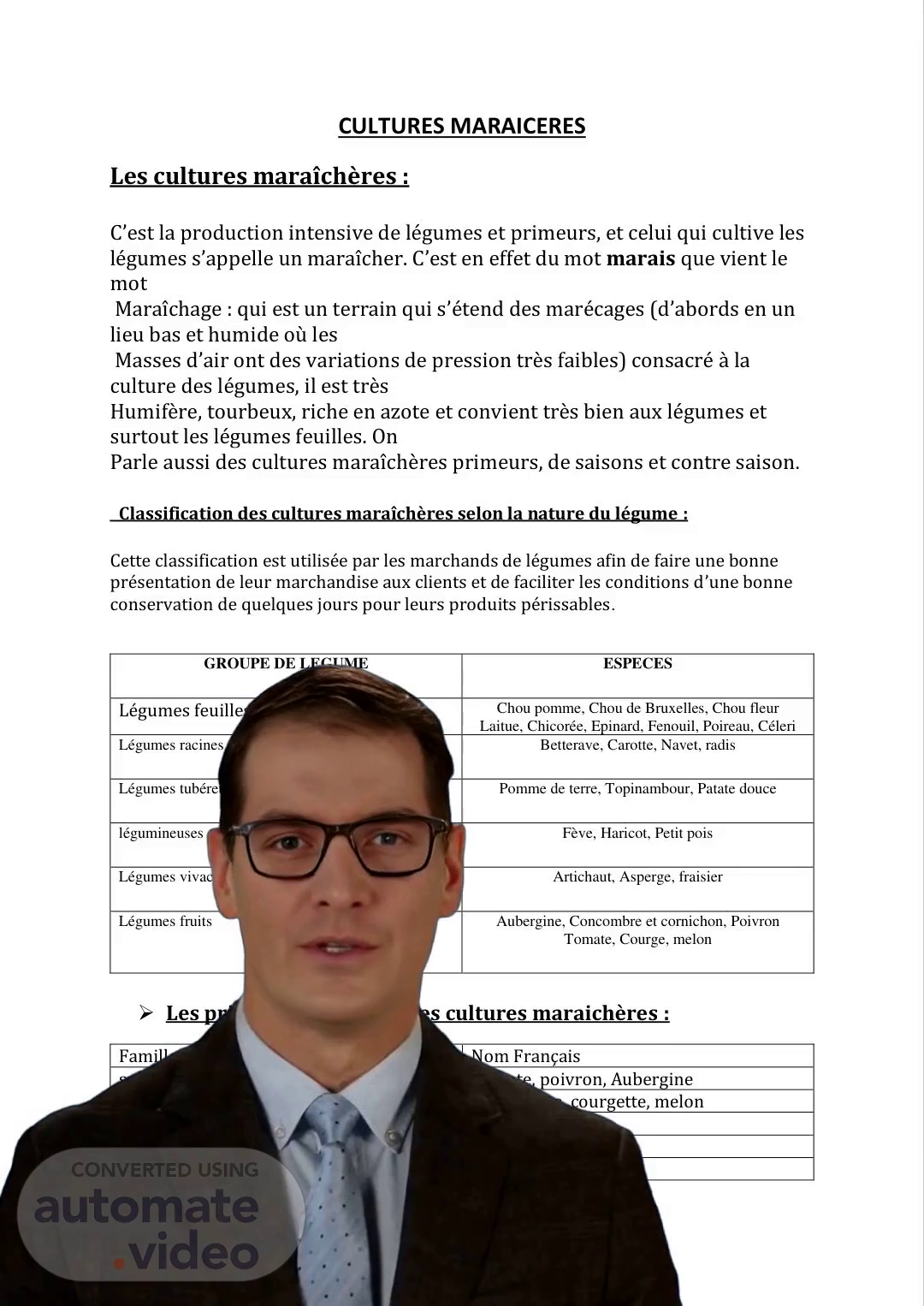 [Virtual Presenter] Bonjour et bienvenue à cette présentation sur les cultures maraîchères. Aujourd'hui, nous allons aborder la production intensive de légumes et primeurs ainsi que les différents types de cultures maraîchères en fonction du légume cultivé. Tout d'abord, qu'est-ce que les cultures maraîchères ? Il s'agit de la production intensive de légumes et primeurs, gérée par un maraîcher. Le terme "maraîchage" vient du mot "marais" qui désigne un terrain situé dans des zones basses et humides, idéal pour la culture de légumes. Ces terrains sont riches en azote et en humus, ce qui les rend parfaits pour les légumes, en particulier les légumes feuilles. On parle également de cultures maraîchères primeurs, saisonnières et hors-saison. Ces catégories sont utilisées par les marchands de légumes pour présenter leur marchandise de manière efficace aux clients et en faciliter la conservation. Il existe différentes catégories de légumes dans les cultures maraîchères en fonction de leur nature. Par exemple, il y a des légumes feuilles tels que le chou, la laitue et le céleri. Les légumes racines, comme la carotte et le radis, sont également très populaires. Il y a aussi des légumes tubéreux tels que la pomme de terre, le topinambour et la patate douce. Les légumineuses, comme les fèves, les haricots et les petits pois, sont également largement cultivées. Enfin, on peut trouver des légumes vivaces tels que l'artichaut, l'asperge et le fraisier, ainsi que des légumes fruits comme l'aubergine, le concombre, le poivron, la tomate et le melon. Pour résumer, les principales familles de cultures maraîchères sont les solanacées, qui regroupent des légumes tels que la tomate, le poivron et l'aubergine, les cucurbitacées avec le concombre, la courgette et le melon, les légumineuses comme le petit pois et la fève, les crucifères incluant le raifort et le navet, et enfin les composées telles que la chicorée et la laitue. Cela conclut la première partie de notre présentation sur les cultures maraîchères. Dans la suite de cette formation, nous aborderons les différentes techniques de production et de conservation des légumes dans le cadre du maraîchage. Merci de votre attention et à bientôt pour la suite de cette présentation..
