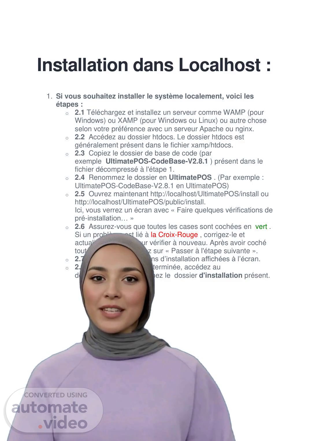 [Virtual Presenter] Pour installer le système localement, il est nécessaire de suivre quelques étapes. Tout d'abord, vous devrez télécharger et installer un serveur tel que WAMP ou XAMP, en fonction de vos préférences, avec un serveur Apache ou nginx. Ensuite, accédez au dossier htdocs qui se trouve généralement dans le fichier xamp/htdocs. Une fois que vous y êtes, copiez le dossier de base de code présent dans le fichier que vous aurez préalablement décompressé à l'étape 1. Puis, renommez le dossier en UltimatePOS. Pour cela, il vous suffit de changer le nom du dossier de base, par exemple de UltimatePOS-CodeBase-V2.8.1 en UltimatePOS. Ensuite, ouvrez votre navigateur et entrez l'adresse http://localhost/UltimatePOS/install ou http://localhost/UltimatePOS/public/install. Sur cette page, vous verrez un écran affichant "Faire quelques vérifications de pré-installation...". Assurez-vous que toutes les cases sont cochées en vert. Si un problème est indiqué avec une croix rouge, corrigez-le et rafraîchissez la page pour vérifier de nouveau. Une fois toutes les cases cochées, cliquez sur "Passer à l'étape suivante". Vous serez ensuite guidé à travers les instructions d'installation à l'écran. Une fois l'installation terminée, rendez-vous dans le dossier public et supprimez le dossier d'installation présent. Et voilà, votre système est désormais installé localement et prêt à être utilisé. Merci de votre attention et à bientôt pour la suite de cette formation..