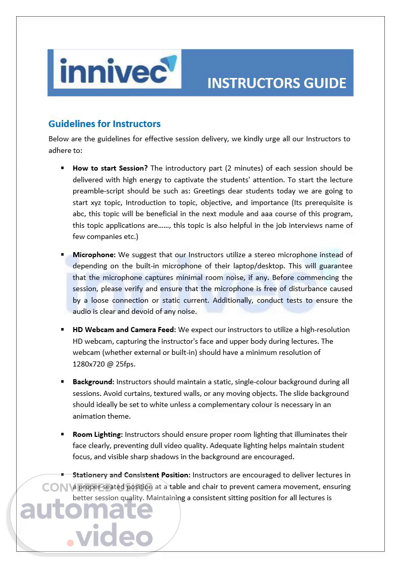 [Audio] Good morning students. Today we will be talking about guidelines for instructors to guarantee effective session delivery. Before we start, our instructors should consider using a stereo microphone, an HD webcam, a static single-color background, proper room lighting and a consistent position while delivering lectures. The introductory part should be delivered with high energy to capture the students' attention. It is beneficial to talk about the topic, its objectives, importance and applications. To ensure the audio is clear and free of any noise, please verify the microphone connection and test the audio quality. The webcam should have a minimum resolution of 1280x720 @ 25fps. To maintain the same background color during the session, curtains, textured walls and moving objects should be avoided. Lastly, proper room lighting is essential as it affects the quality of the video output. With these guidelines, our instructors are all set to deliver an effective session..
