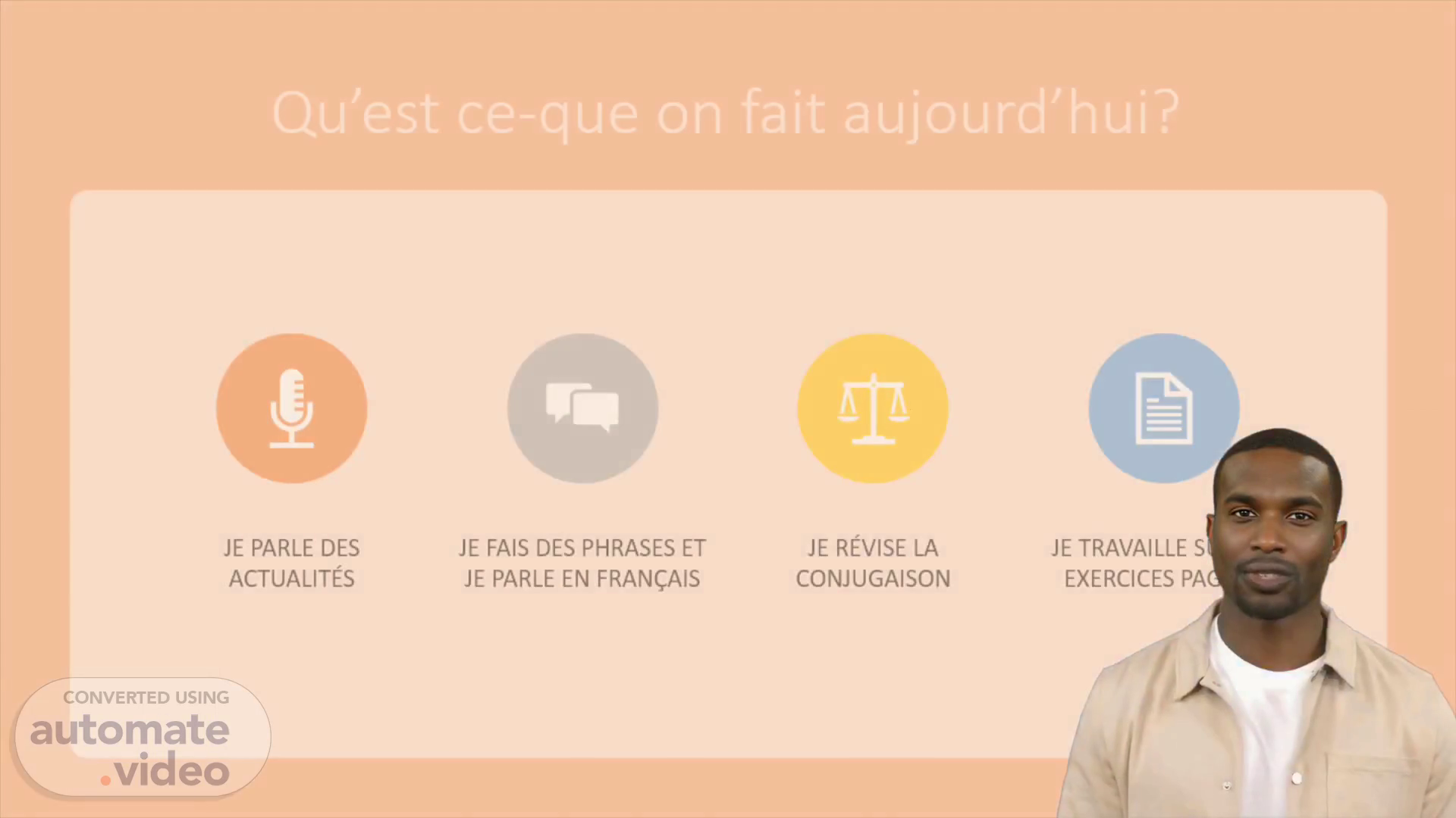 [Virtual Presenter] Aujourd'hui, nous allons travailler ensemble sur les actualités, les phrases et le français, réviser la conjugaison et effectuer des exercices sur les pages 18 et 19. J'espère que vous êtes prêts pour vous impliquer dans ces activités et que vous allez bien travailler. Alors commençons !.