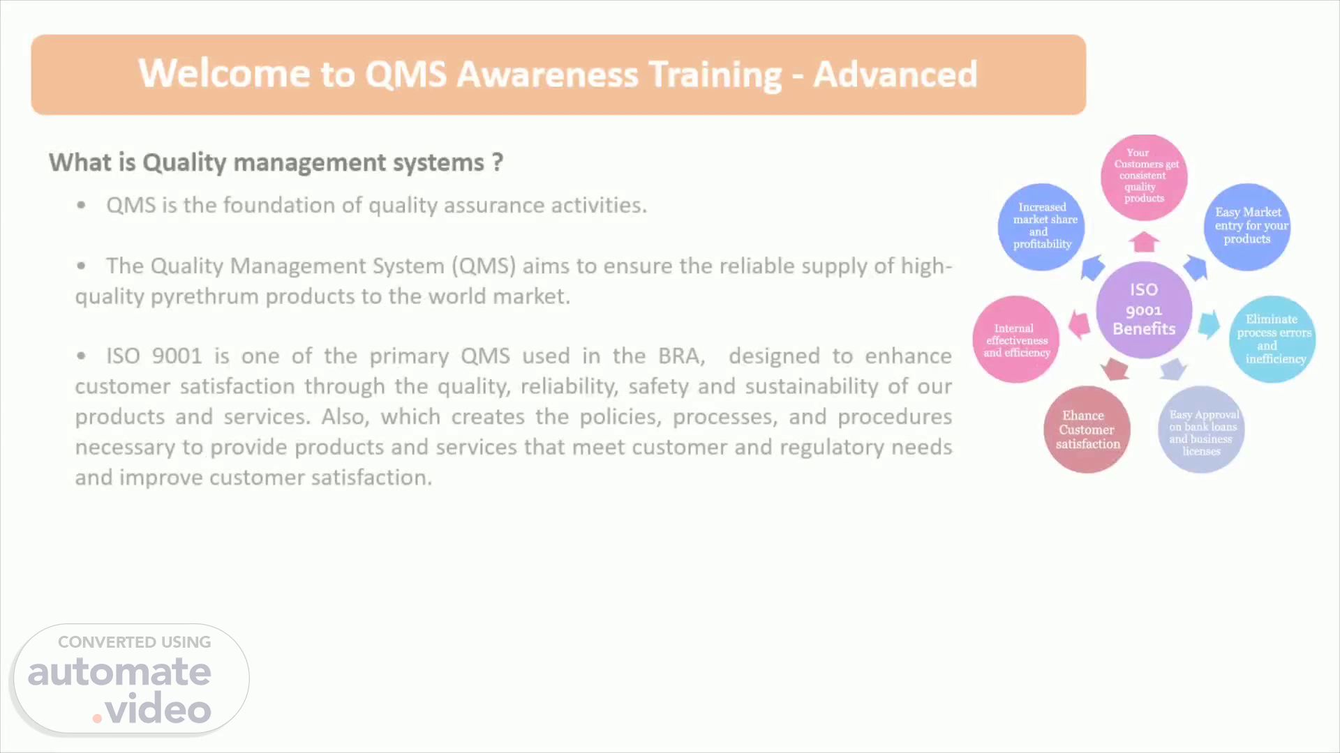 [Virtual Presenter] Welcome to QMS Awareness Training – Advanced First of all we will understand What is the Quality management systems ? QMS is the foundation of quality assurance activities. The Quality Management System (QMS) aims to ensure the reliable supply of high-quality pyrethrum products to the world market. ISO 9001 is one of the primary QMS used in the BRA, designed to enhance customer satisfaction through the quality, reliability, safety and sustainability of our products and services. Also, which creates the policies, processes, and procedures necessary to provide products and services that meet customer and regulatory needs and improve customer satisfaction. Let’s see Why the knowledge of QMS is essential for BRA staff? QMS is essential to improve internal effectiveness and efficiency to increase the quality of the product. Also, helps to simplify the process and make them happen consistently, with no change in the process who or whenever done and make it easy to understand the process. .