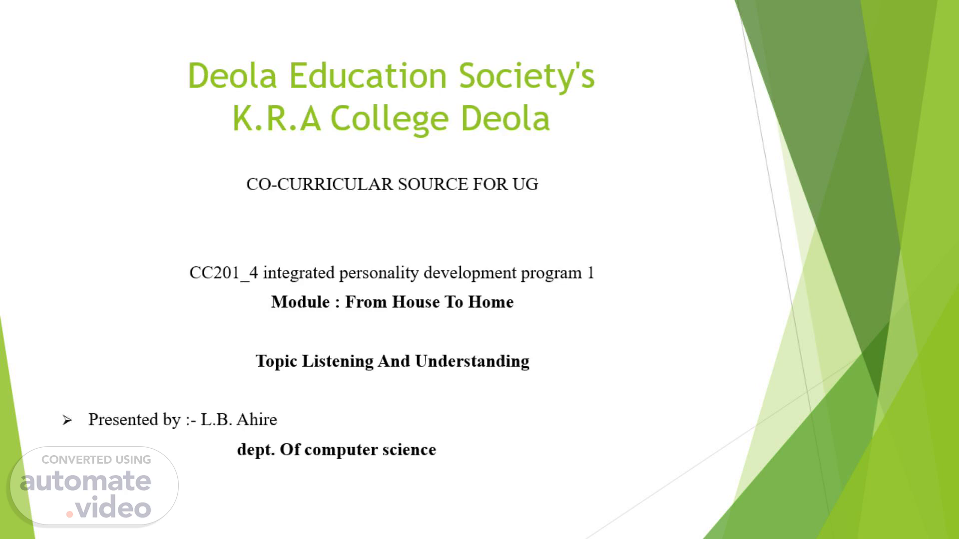 [Audio] Deola Education Society's K.R.A College Deola CO-CURRICULAR SOURCE FOR UG CC201_4 integrated personality development program 1 Module : From House To Home Topic Listening And Understanding Presented by :- L.B. Ahire dept. Of computer science.