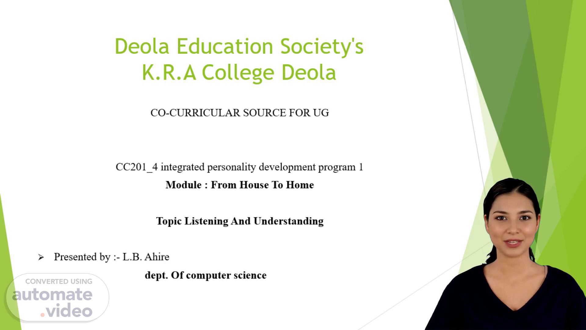 [Virtual Presenter] Deola Education Society's K R A College Deola Co curricular Source For Ug CC201_4 integrated personality development program 1 Module : From House To Home Topic Listening And Understanding Presented by : L B Ahire dept. Of computer science.
