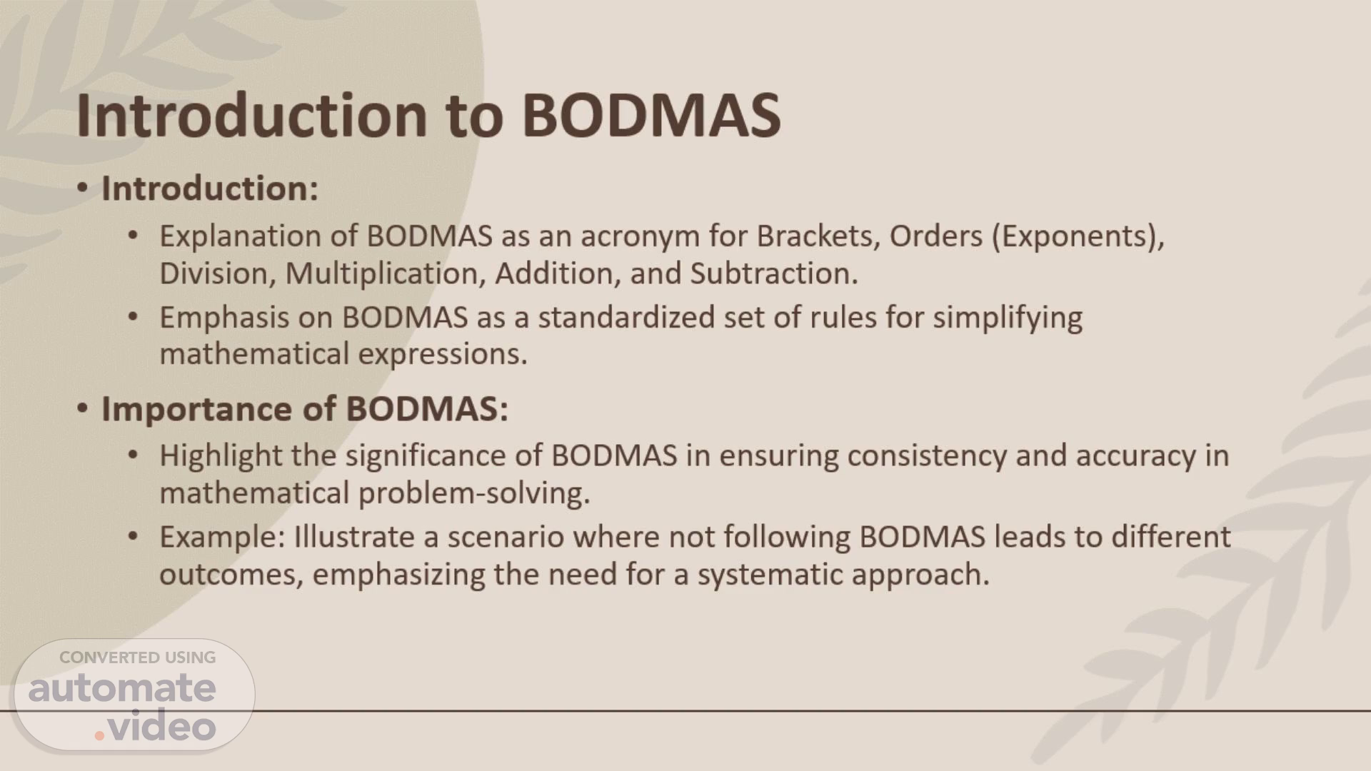 [Audio] Welcome to our presentation on Understanding BODMAS. BODMAS stands for Brackets, Orders (Exponents), Division, Multiplication, Addition, and Subtraction. It is a set of rules that provides a standardized approach to simplifying mathematical expressions, ensuring consistency and accuracy in problem-solving. As we delve into each component, you'll discover the significance of following the order of operations..