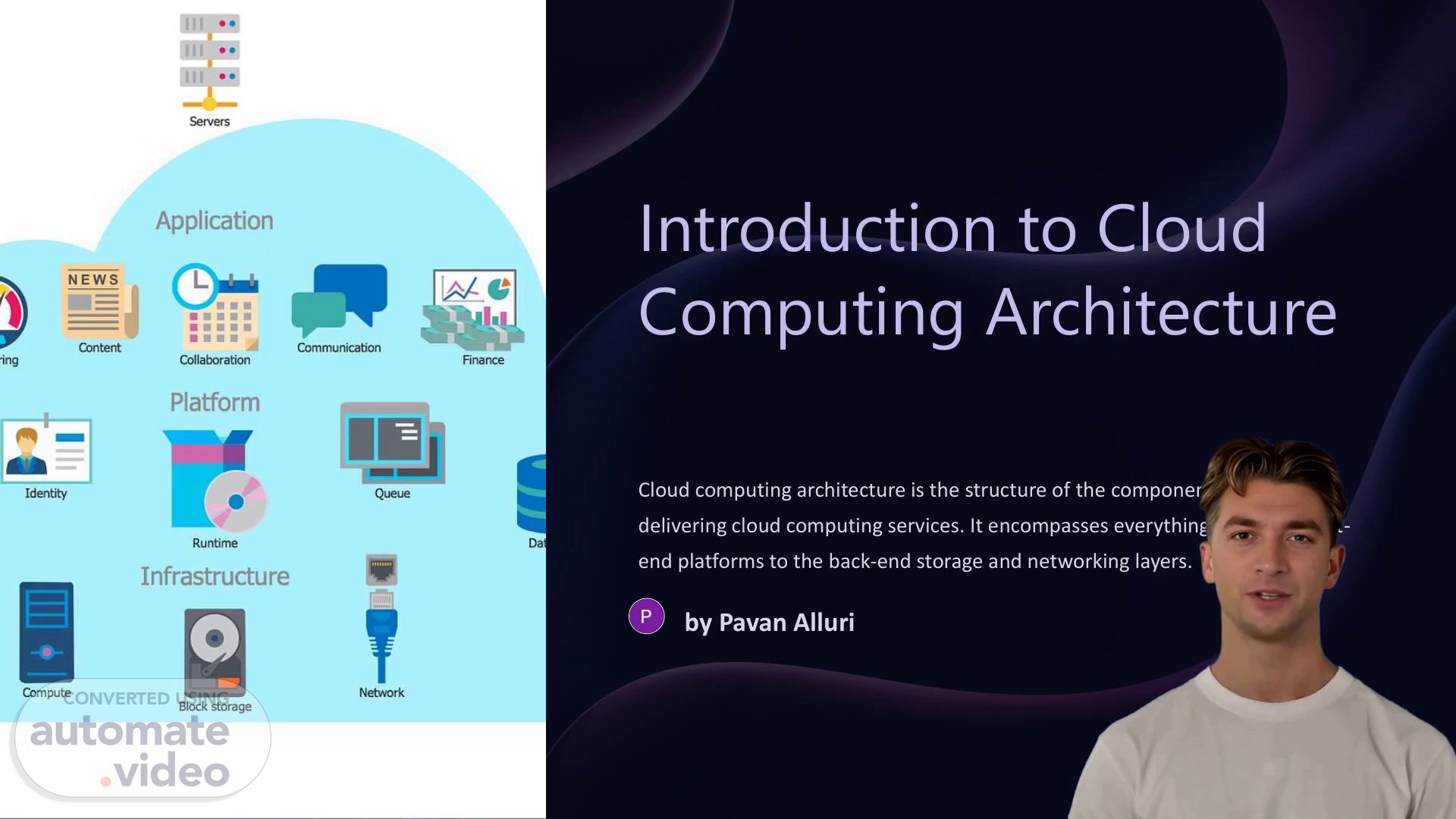 [Virtual Presenter] Cloud computing architecture is the foundation for understanding how cloud systems work. It is important to understand the different components and how they interact to deliver the cloud computing services required. This slide introduces the components of cloud computing architecture and how they interact with each other. By looking at the structure and roles the viewer will gain an appreciation for how cloud computing works." Cloud computing architecture is the foundation of a cloud computing system. It is the structure of the components that together make up the cloud system and make cloud computing services possible. Cloud computing architecture is composed of several different components from the frontend platforms to the back-end storage and networking layers. These components work together to provide the user with the services they need. Through a combination of hardware and software the components of cloud computing architecture are able to provide reliable and efficient services..