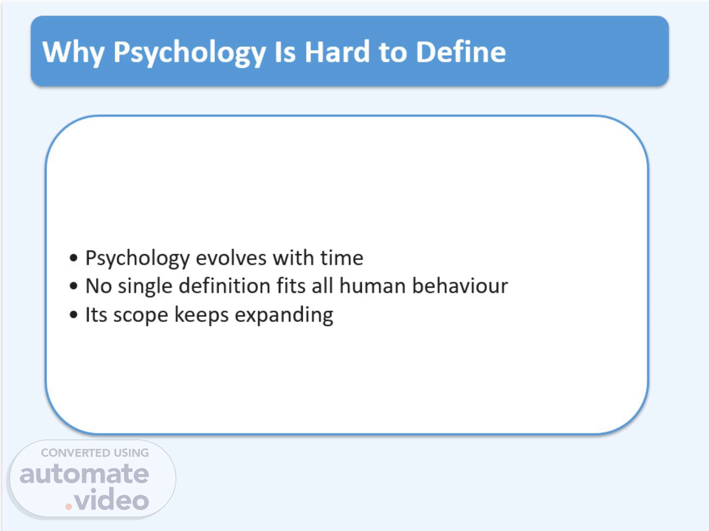 [Audio] Psychology is not easy to define because it keeps changing as new knowledge develops. Human behaviour is complex, and no single definition can capture everything it includes. That's why the meaning and scope of psychology have expanded over time..