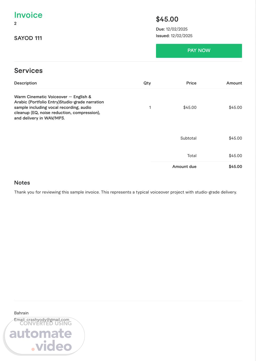 Invoice 2 SAYOD 111 $45.00 Due: 12D02D2025 Issued: 12D02D2025 PAY NOW Services Description Qty Price Amount Warm Cinematic Voiceover — English & Arabic (Portfolio Entry)Studio-grade narration sample including vocal recording, audio cleanup (EQ, noise reduction, compression), and delivery in WAV/MP3. 1 $45.00 $45.00 Subtotal $45.00 Total $45.00 Amount due $45.00 Notes Thank you for reviewing this sample invoice. This represents a typical voiceover project with studio-grade delivery. Bahrain Email: [email protected].