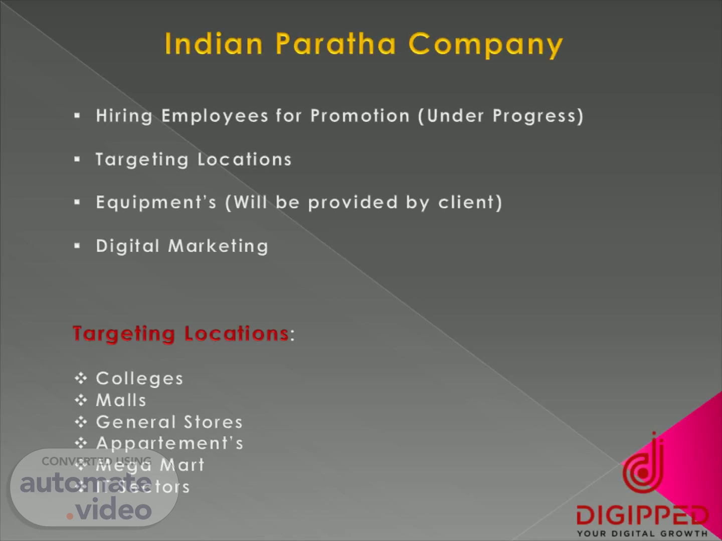 Indian Paratha Company Hiring Employees for Promotion (Under Progress ) Targeting Locations Equipment’s (Will be provided by client) Digital Marketing Targeting Locations : Colleges Malls General Stores Appartement’s Mega Mart IT Sectors.