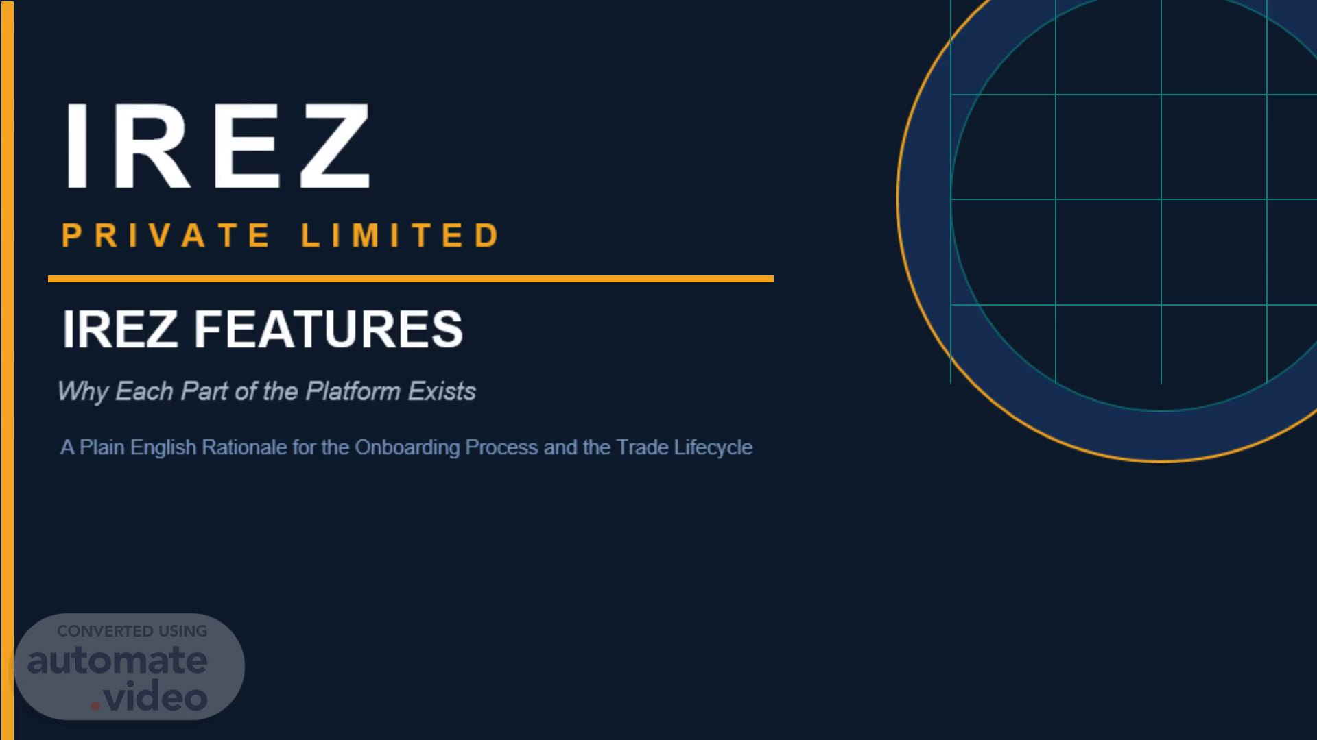 [Audio] Welcome to IREZ Private Limited. This presentation explains not just what the IREZ platform does, but why every stage, every verification step, and every control exists in the precise position it occupies within the process. It covers the founding context of who IREZ is, the Vision, Mission and Core Values, the five stage onboarding process, and the complete CONSO-ID trade lifecycle from quotation to settlement..