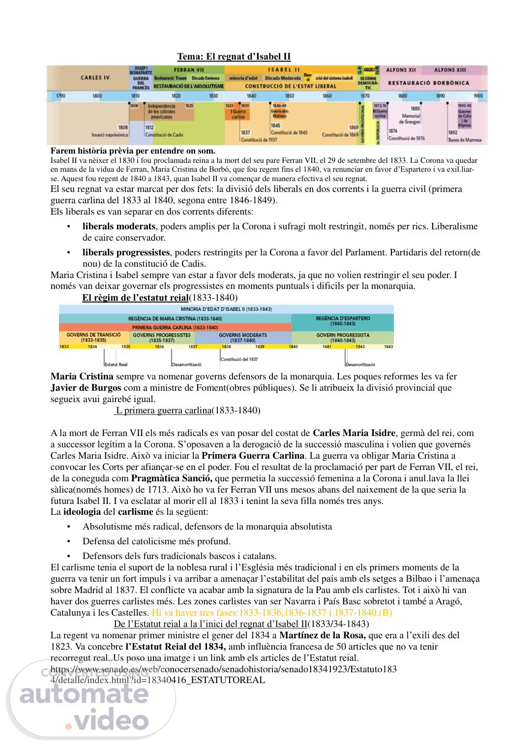 [Audio] Tema: El regnat d'Isabel II Farem història prèvia per entendre on som. Isabel II va nèixer el 1830 i fou proclamada reina a la mort del seu pare Ferran VII, el 29 de setembre del 1833. La Corona va quedar en mans de la vídua de Ferran, Maria Cristina de Borbó, que fou regent fins el 1840, va renunciar en favor d'Espartero i va exil.liarse. Aquest fou regent de 1840 a 1843, quan Isabel II va començar de manera efectiva el seu regnat. El seu regnat va estar marcat per dos fets: la divisió dels liberals en dos corrents i la guerra civil (primera guerra carlina del 1833 al 1840, segona entre 1846-1849). Els liberals es van separar en dos corrents diferents: liberals moderats, poders amplis per la Corona i sufragi molt restringit, només per rics. Liberalisme de caire conservador. liberals progressistes, poders restringits per la Corona a favor del Parlament. Partidaris del retorn(de nou) de la constitució de Cadis. Maria Cristina i Isabel sempre van estar a favor dels moderats, ja que no volien restringir el seu poder. I només van deixar governar els progressistes en moments puntuals i dificils per la monarquia. El règim de l'estatut reial(1833-1840) Maria Cristina sempre va nomenar governs defensors de la monarquia. Les poques reformes les va fer Javier de Burgos com a ministre de Foment(obres públiques). Se li atribueix la divisió provincial que segueix avui gairebé igual. L primera guerra carlina(1833-1840) A la mort de Ferran VII els més radicals es van posar del costat de Carles Maria Isidre, germà del rei, com a successor legítim a la Corona. S'oposaven a la derogació de la successió masculina i volien que governés Carles Maria Isidre. Això va iniciar la Primera Guerra Carlina. La guerra va obligar Maria Cristina a convocar les Corts per afiançar-se en el poder. Fou el resultat de la proclamació per part de Ferran VII, el rei, de la coneguda com Pragmàtica Sanció, que permetia la successió femenina a la Corona i anul.lava la llei sàlica(només homes) de 1713. Això ho va fer Ferran VII uns mesos abans del naixement de la que seria la futura Isabel II. I va esclatar al morir ell al 1833 i tenint la seva filla només tres anys. La ideologia del carlisme és la següent: Absolutisme més radical, defensors de la monarquia absolutista Defensa del catolicisme més profund. Defensors dels furs tradicionals bascos i catalans. El carlisme tenia el suport de la noblesa rural i l'Església més tradicional i en els primers moments de la guerra va tenir un fort impuls i va arribar a amenaçar l'estabilitat del país amb els setges a Bilbao i l'amenaça sobre Madrid al 1837. El conflicte va acabar amb la signatura de la Pau amb els carlistes. Tot i això hi van haver dos guerres carlistes més. Les zones carlistes van ser Navarra i País Basc sobretot i també a Aragó, Catalunya i les Castelles. Hi va haver tres fases:1833-1836,1836-1837 i 1837-1840.(B) De l'Estatut reial a la l'inici del regnat d'Isabel II(1833/34-1843) La regent va nomenar primer ministre el gener del 1834 a Martínez de la Rosa, que era a l'exili des del 1823. Va concebre l'Estatut Reial del 1834, amb influència francesa de 50 articles que no va tenir recorregut real..Us poso una imatge i un link amb.