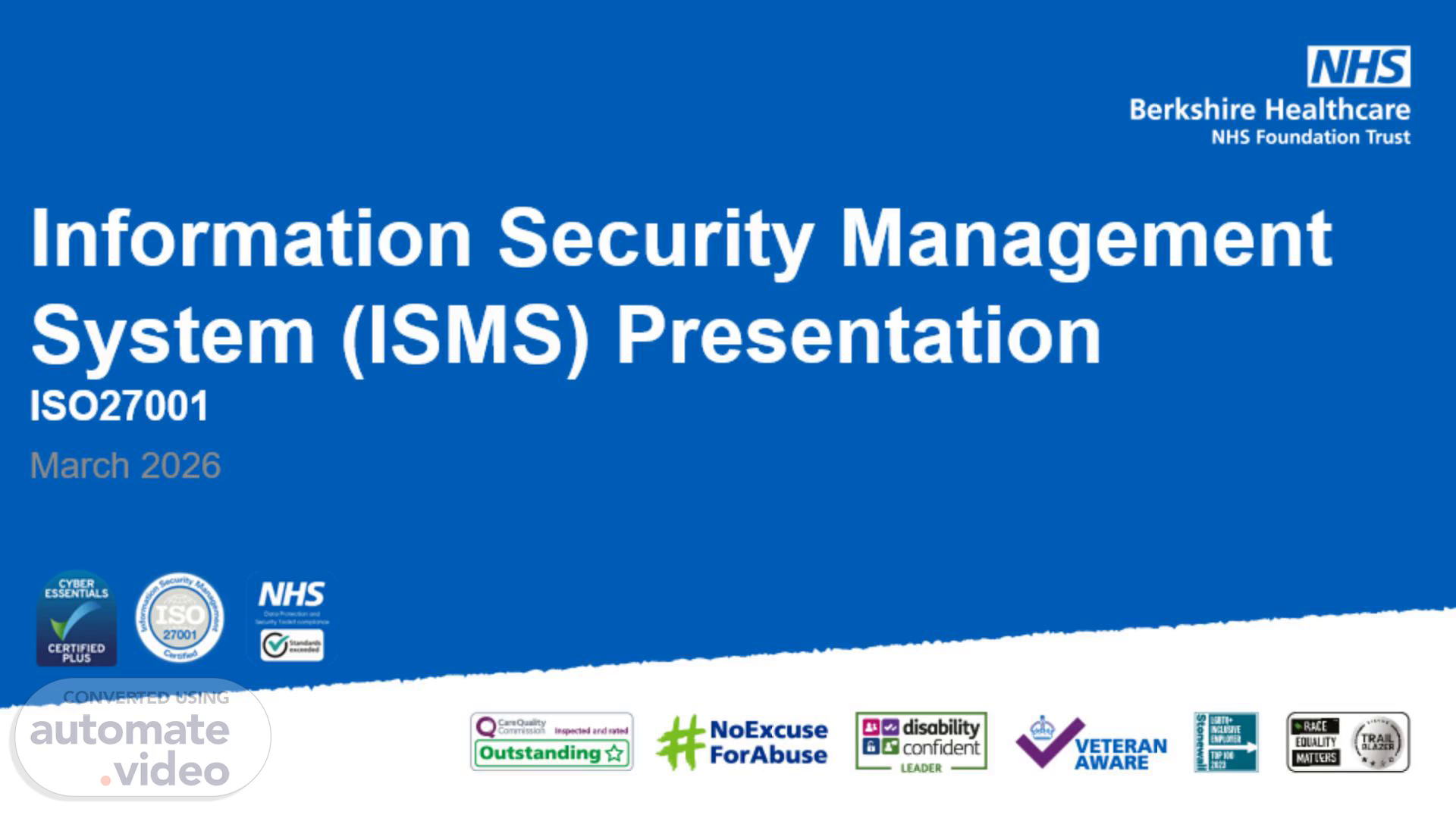 [Audio] The first step is to explain that ISO twenty-seven thousand and one is a globally recognised security standard that provides a framework for best‑practice in protecting information in a structured, risk‑based way. By using this framework for identifying risks and applying controls we can demonstrate consistent, auditable, well‑governed security practices across the Trust. Having an ISO twenty-seven thousand and one certification shows commitment to strong security practices and continual improvement in how we protect people, systems, and data..